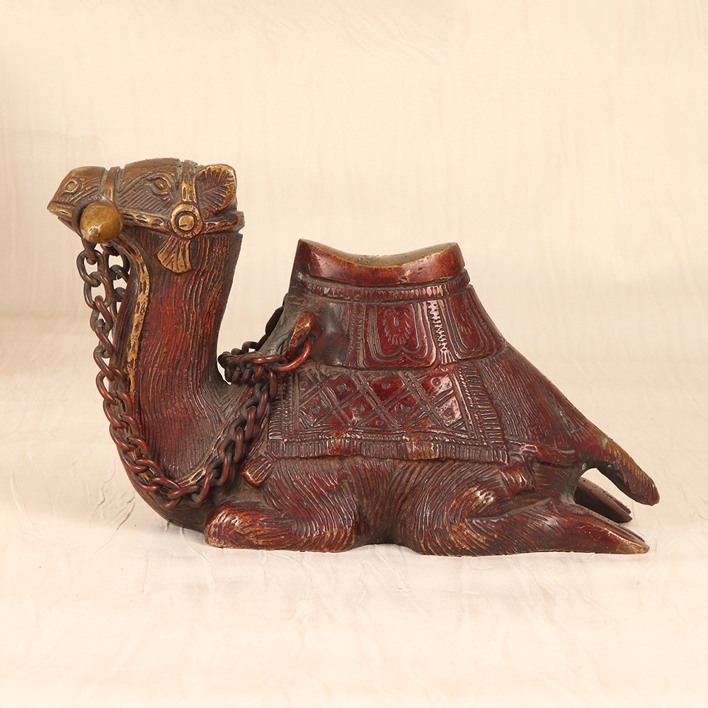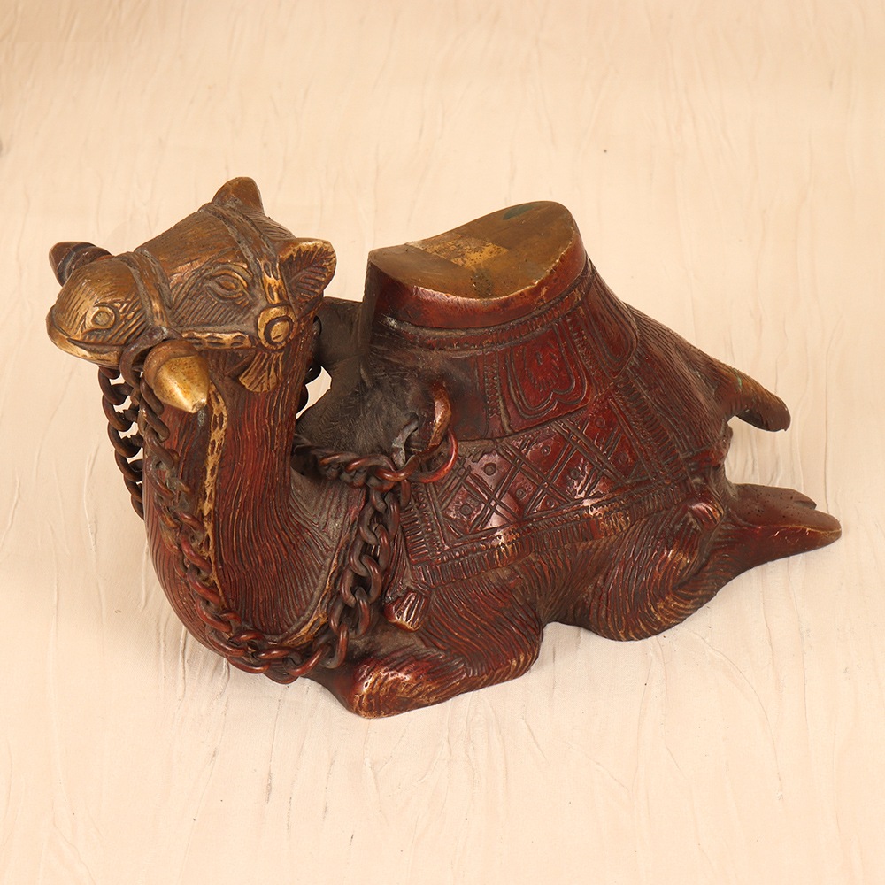 Introducing the perfect addition to any worldly-inspired home decor - our stunning vintage brass camel statue. Crafted with meticulous attention to detail, this exquisite piece is a true work of art, evoking the rich cultural heritage of the Middle East. Imagine the captivating presence this vintage brass camel statue will bring to your space. Its warm, metallic tones and intricate design will instantly command attention, drawing the eye and sparking curiosity. Whether you're a seasoned collector of global artifacts or simply seeking to infuse your home with a touch of exotic flair, this statue is sure to enchant. Display this stunning piece in your living room, bedroom, or office to transport yourself and your guests to the heart of ancient desert landscapes. Its timeless appeal will complement a variety of decor styles, from boho-chic to modern minimalist, elevating the ambiance and transforming your space into a sanctuary of worldly sophistication. Embrace the beauty of the past and let our vintage brass camel statue become the centerpiece of your home. Elevate your interior with the majestic presence of this exquisite accent piece, inspiring wonder and admiration in all who behold it.