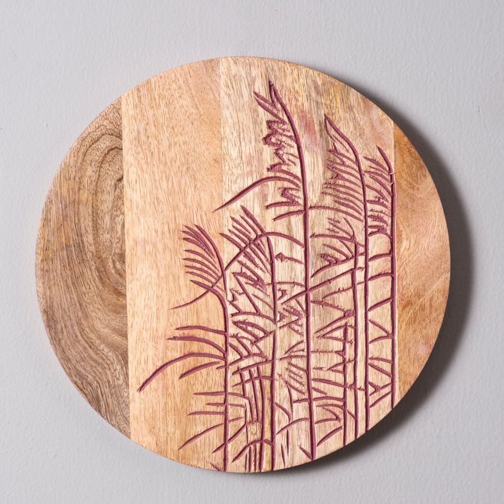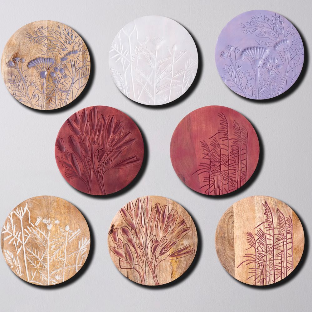 Each plate is individually hand-engraved with natural patterns, celebrating the harmony of rustic wood and refined artistry.