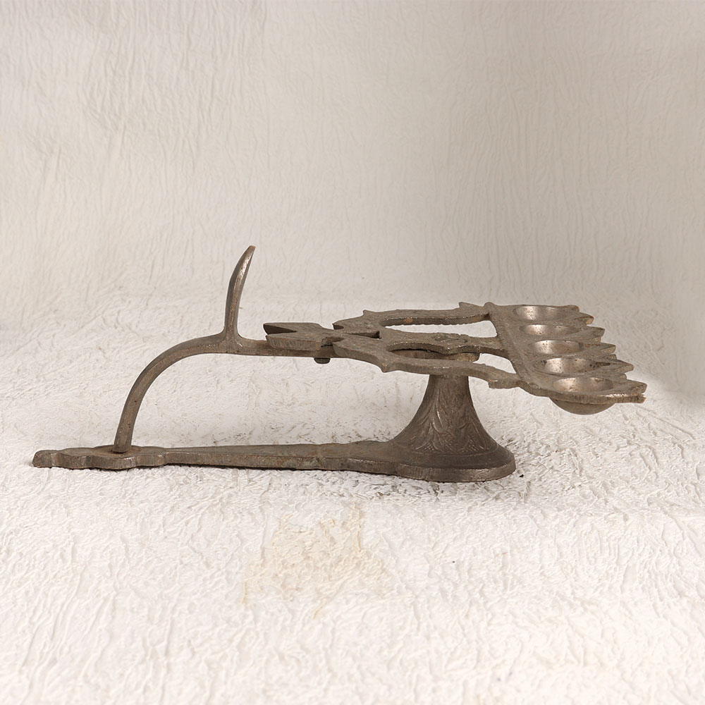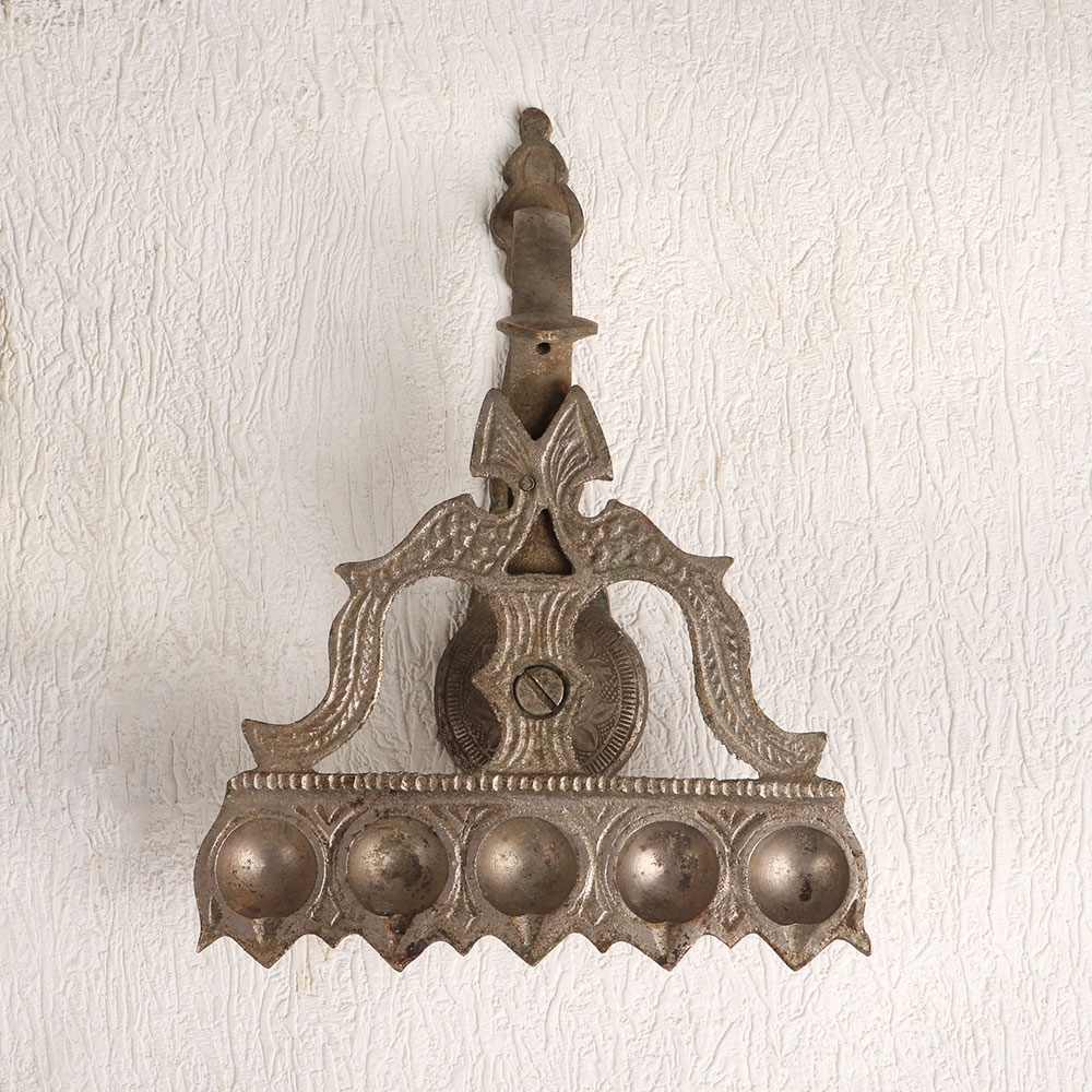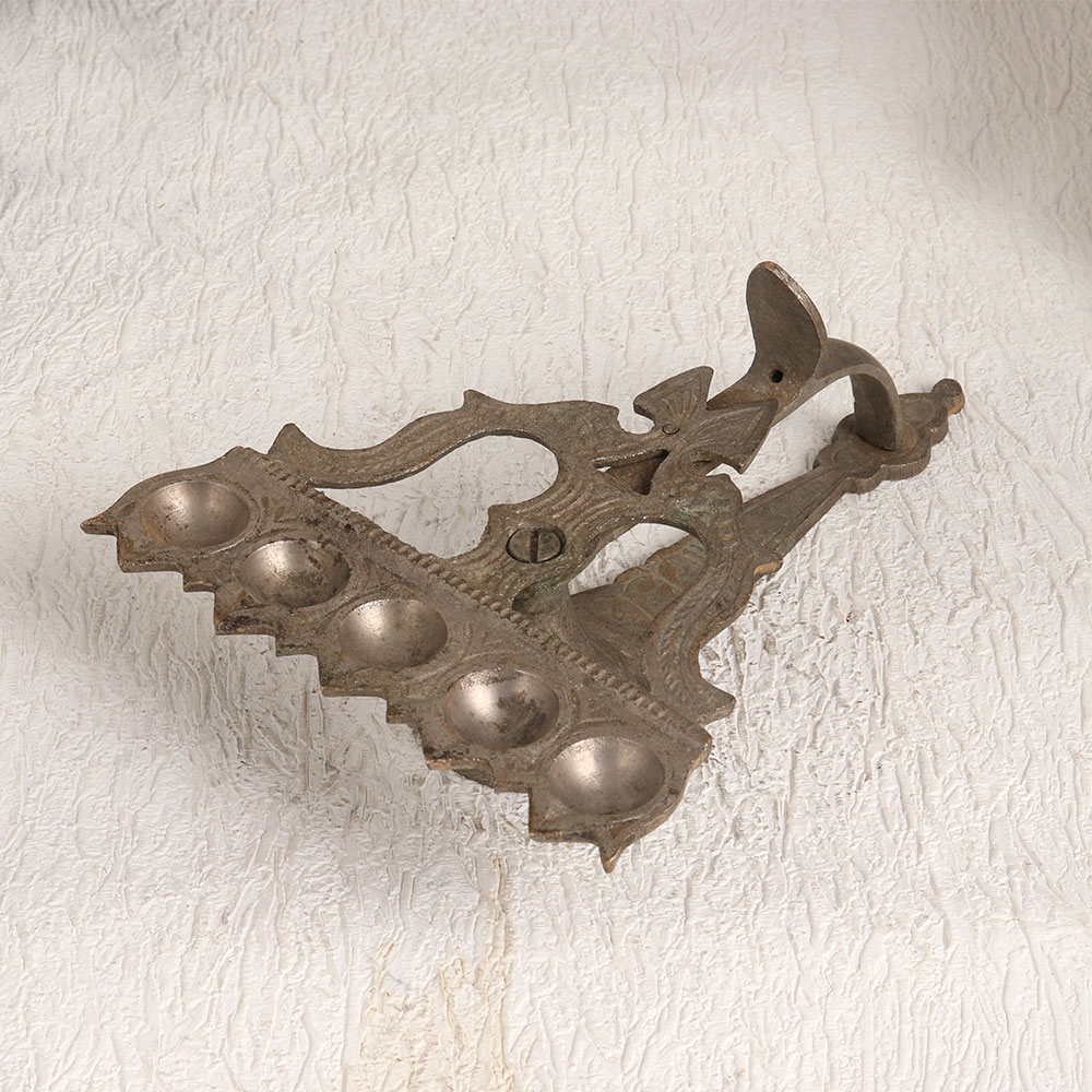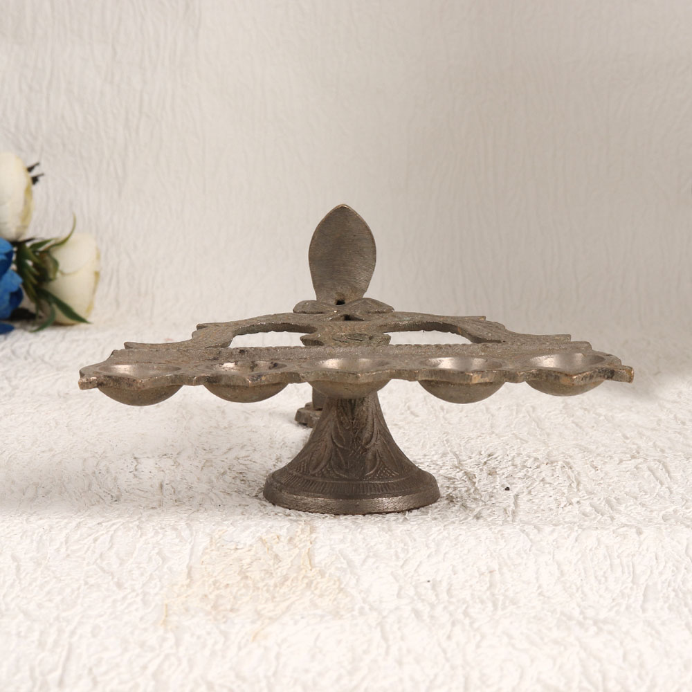 A Vintage Brass Aarti Oil Lamp that features a distinctive cobra handle and a rich antique gray finish. Handmade by talented artisans from high-quality brass, this lamp is a true work of art that seamlessly blends tradition and elegance. This exquisite piece can be a captivating addition to your home, office, restaurant, hotel, cafe, or shop, enhancing the ambiance with its exquisite craftsmanship. Its practical and symbolic purpose makes it perfect for both decoration and use during prayer, rituals, and auspicious occasions. The lamp accommodates up to five jyots, which can be lit using either mustard oil or ghee with cotton wicks. This versatile feature ensures that it is not just a visual delight, but also a functional item for religious ceremonies. Moreover, our Vintage Brass Aarti Oil Lamp is a remarkable addition to any vintage collection, exuding a sense of nostalgia and cultural heritage. It can also serve as a heartfelt gift for your family, friends or relatives on special, festive, or auspicious occasions, carrying with it the warmth of tradition and the artistry of skilled craftsmen.