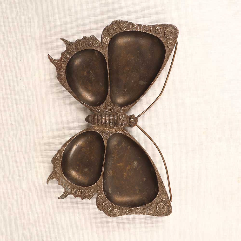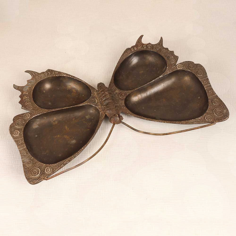 Display your hors d'oeuvres and desserts with a touch of antique whimsy using the brass butterfly serving tray. This vintage-style centerpiece features intricate solid brass metalwork handcrafted into a graceful butterfly silhouette. An ornate vintage find, this tray transforms any table into a work of art. The embossed antique brass metalwork creates the charming shape of a butterfly, complete with delicate wings and an intricately decorated body. Place it in the center of your table to hold appetizers, sweets and other treats for guests. When not in use, display this butterfly tray as decor to add a beautiful vintage accent to your home. Ideal for vintage lovers who want an artistic statement piece that can pull double duty as a server. This ornate brass butterfly tray brings sophistication and charm to any space.