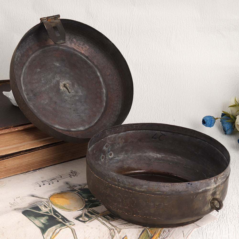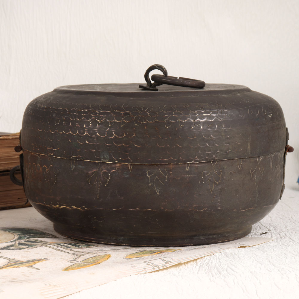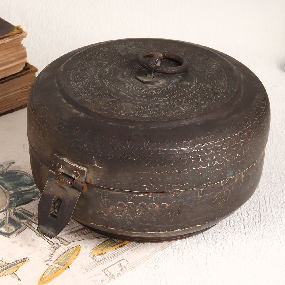 This vintage brass Chapati box in a rich brown finish is a true testament to the skill and artistry of Indian artisans. Handmade with precision and love, this exquisite piece is made from high-quality brass, showcasing the heritage of metalwork in India. This Chapati box designed with intricate detailing is not only a practical item but also a stunning decorative piece. Its vintage brown finish exudes warmth and nostalgia, making it a perfect addition to your home, office, restaurant, hotel, cafe, or shop. However, we recommend using it primarily for decorative purposes due to its vintage nature. This charming box can easily become a conversation starter and a highlight of any space. Consider adding it to your vintage collection, displaying it at exhibitions, or gifting it to your family, friends or relatives on special, festive, or auspicious occasions.
