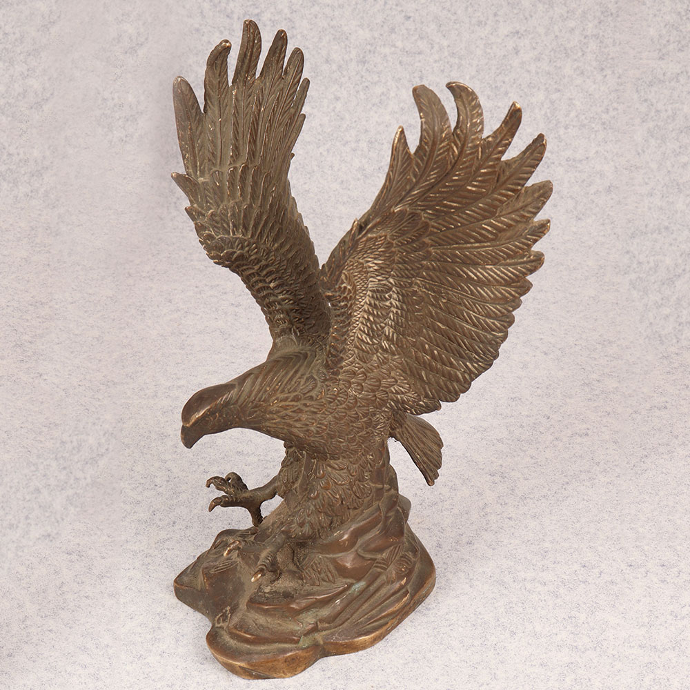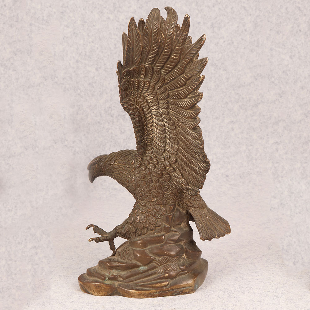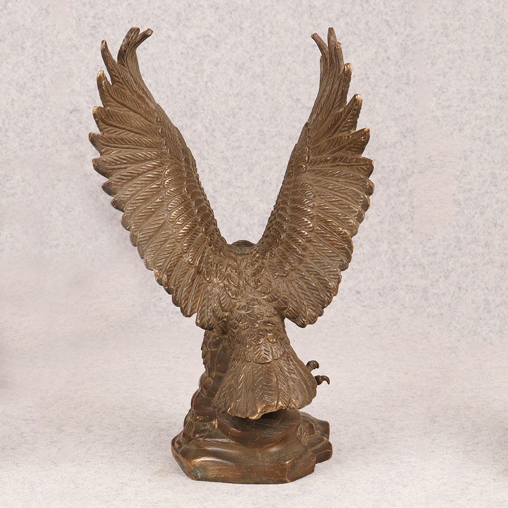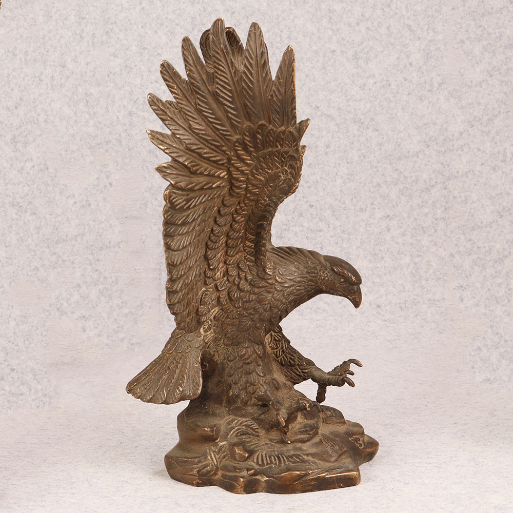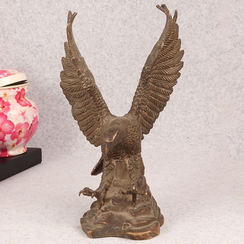 Behold the majestic embodiment of strength and grace in the form of our brass eagle statue, poised in a fearless attacking stance upon a platform. Crafted by talented Indian artisans, this exquisite masterpiece showcases the unparalleled artistry that comes from generations of expertise. The statue's antique brown finish adds a touch of timeless elegance, highlighting the intricate details that bring the noble creature to life. Handmade from high-quality brass, this awe-inspiring eagle statue is a symbol of power and freedom, making it a perfect addition to any space. Whether adorning your home, office, restaurant, hotel, or cafe, its commanding presence captivates attention and elevates the ambiance. Embrace the spirit of vintage charm by incorporating this striking piece into your collection, and watch as it becomes a focal point of admiration. Versatile and meaningful, this brass eagle statue serves as an exceptional gift for your family, friends or relatives on special, festive, or auspicious occasions. Its symbolic representation of strength and courage makes it a thoughtful gesture that resonates with both personal and professional connections.