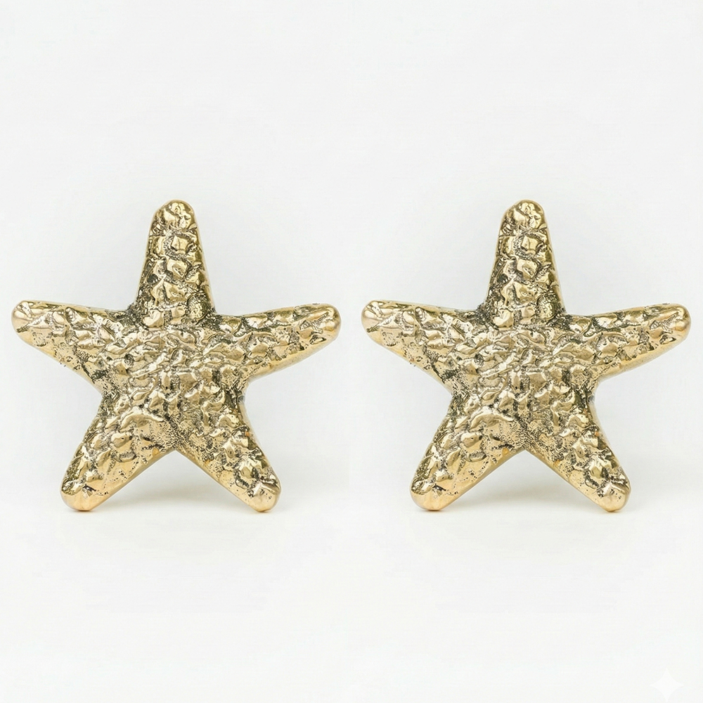 A decorative, Brass drawer pull or knob in the shape of a Starfish. The item has a ridged, fan-like texture and a metallic finish, possibly brass or gold-toned. It is suitable for adding a coastal or vintage accent to furniture like dressers, cabinets, or drawers.
