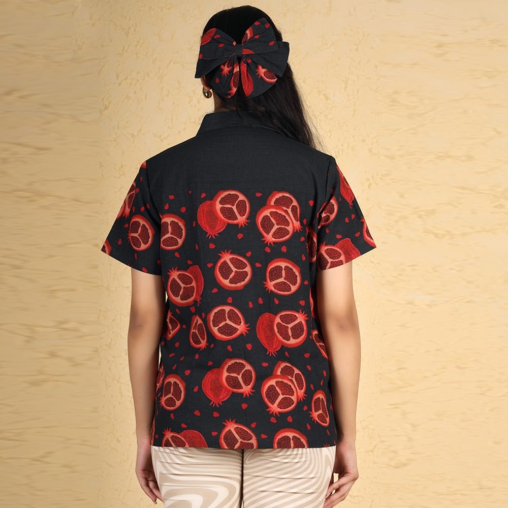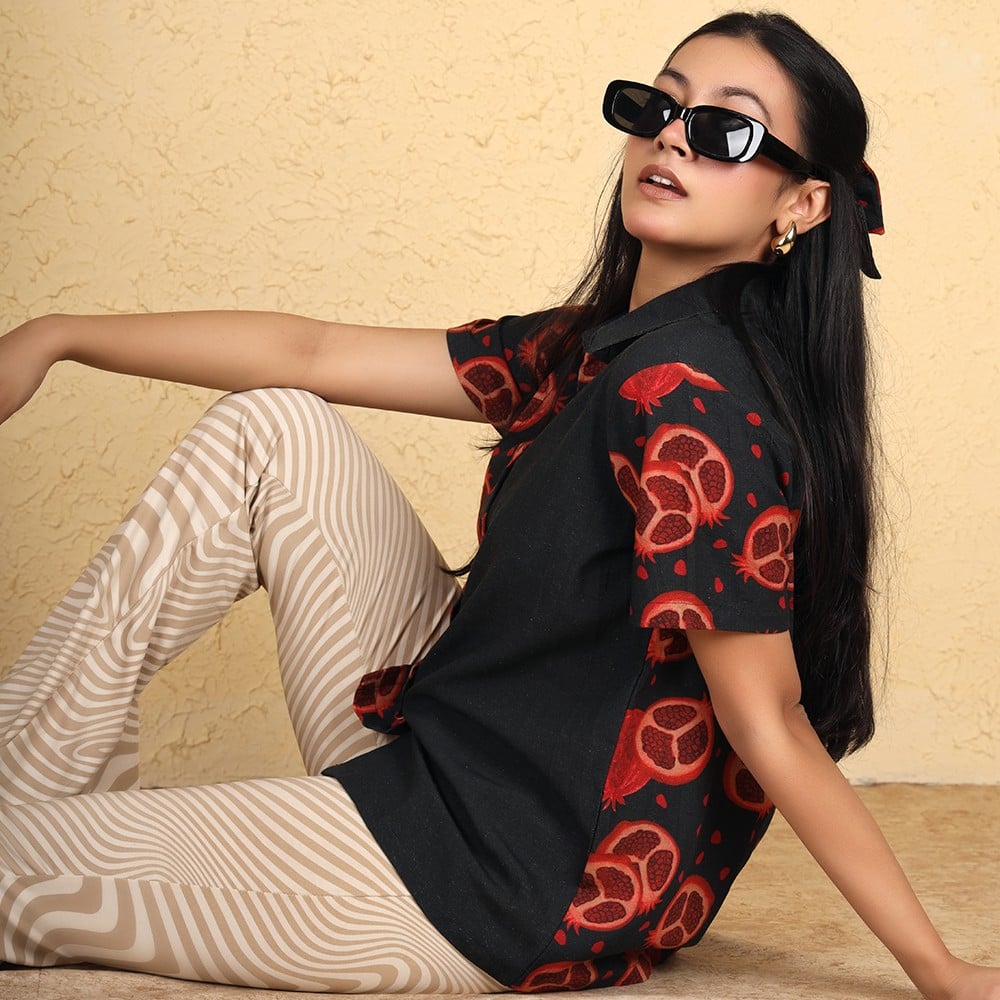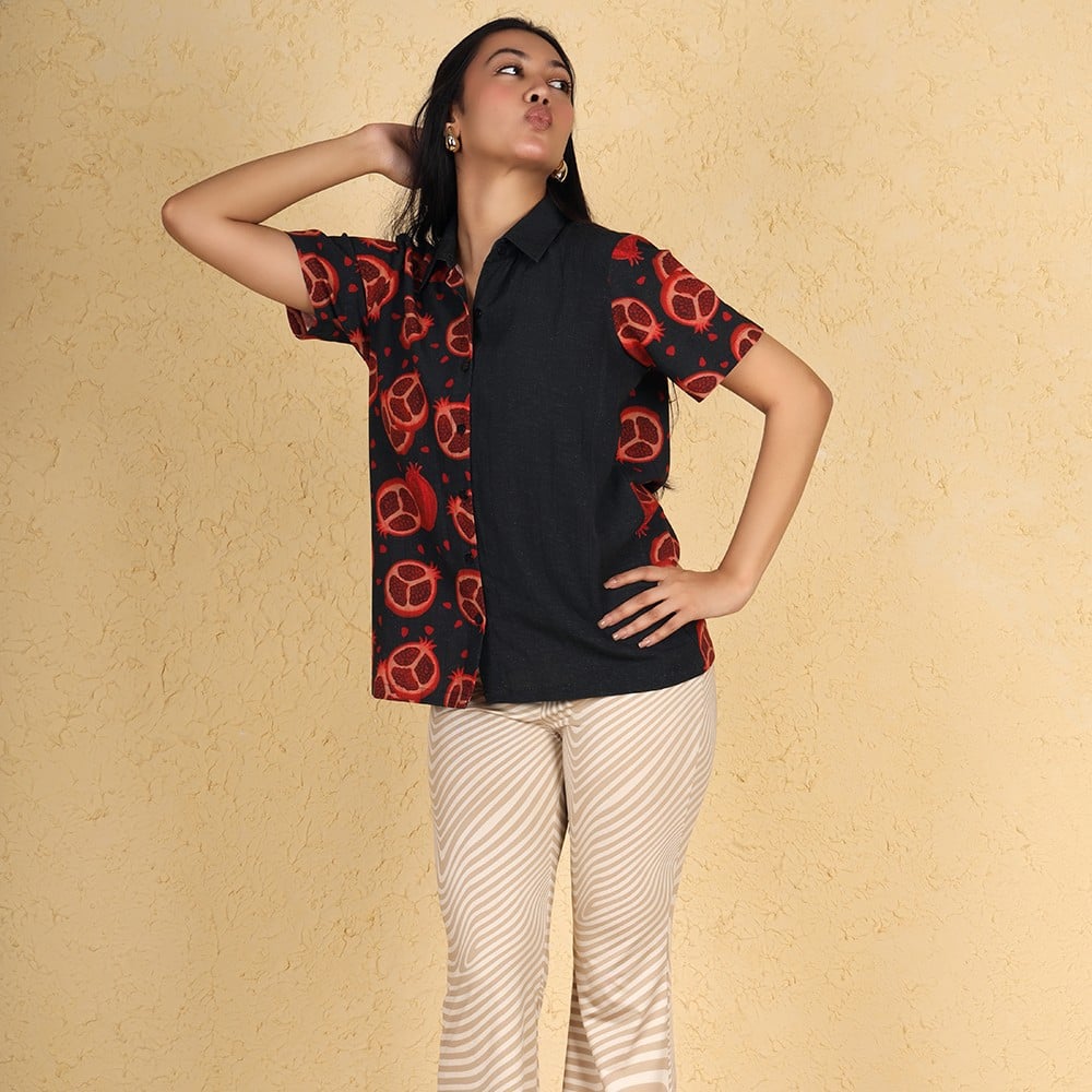 This handcrafted half sleeves pomegranate shirt is designed to make a bold and contemporary style statement. Featuring a striking half-and-half design with vibrant pomegranate prints and a solid black panel, it blends artistic flair with everyday comfort.