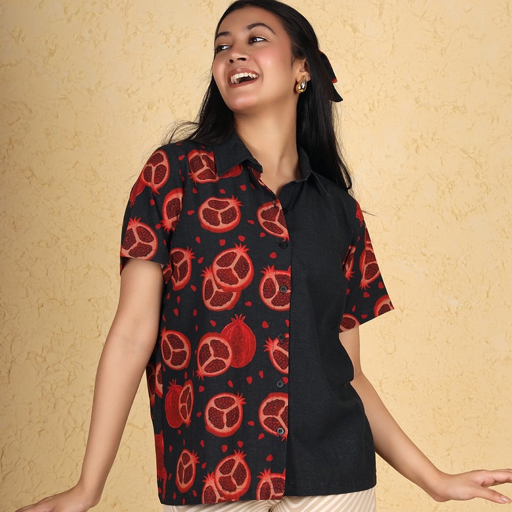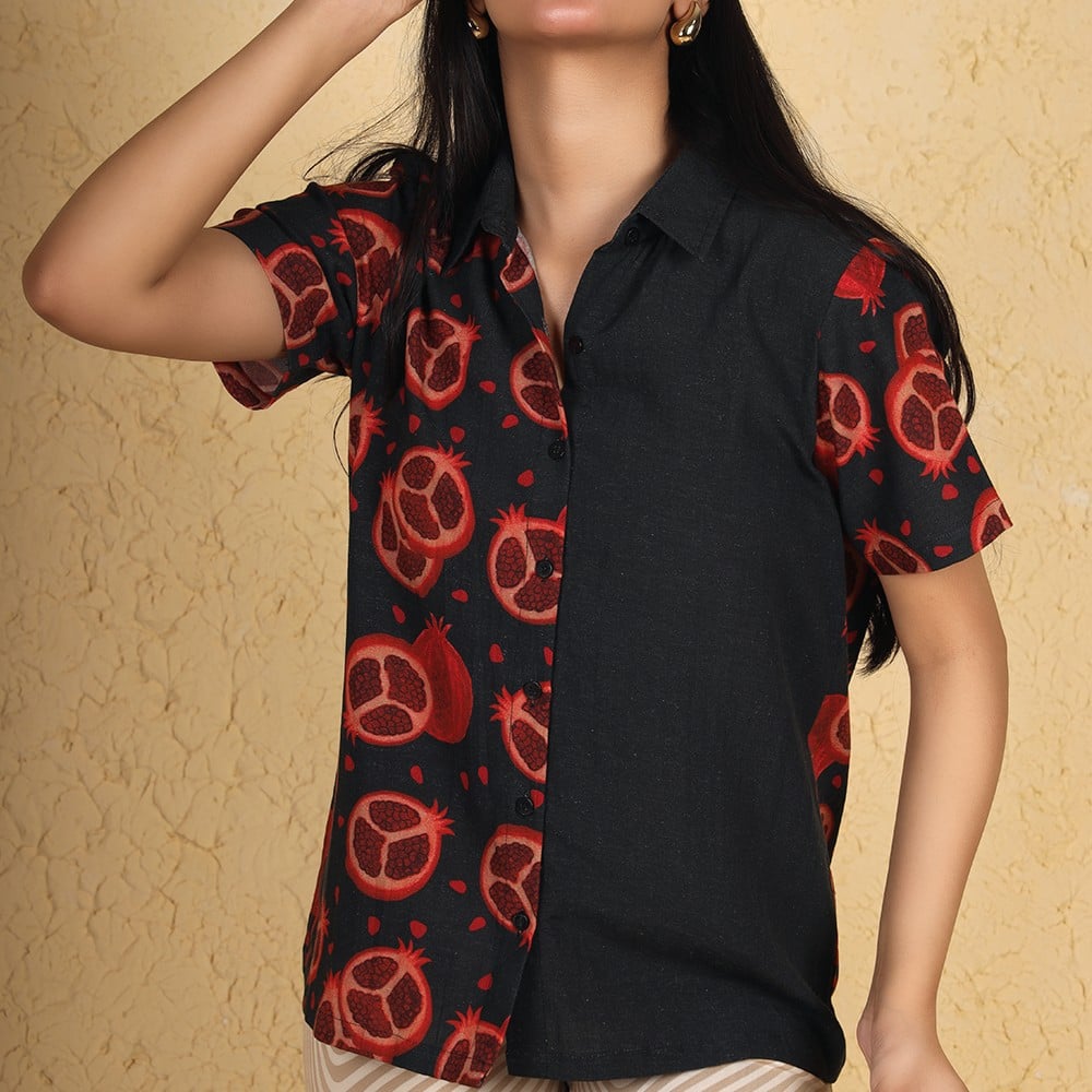 This handcrafted half sleeves pomegranate shirt is designed to make a bold and contemporary style statement. Featuring a striking half-and-half design with vibrant pomegranate prints and a solid black panel, it blends artistic flair with everyday comfort.