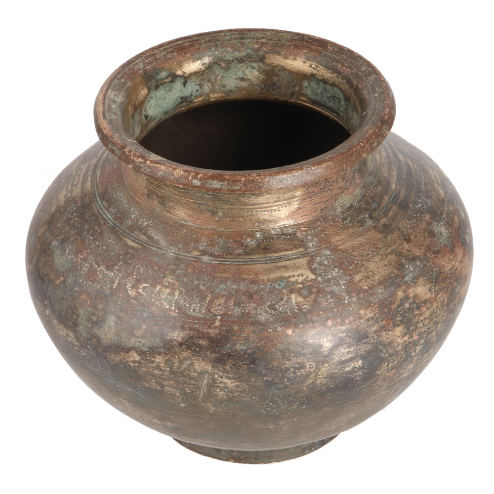 This heavy holy water pot or Kalash was handmade by skilled Indian workers using ancient techniques. It was carved from a brass metal alloy. It has an antique finish and comes with a stand at the bottom to hold it on the surface. The Kalash has a long history in Hindu rituals. They were used to hold Gangajal (holy water from the river Ganga) or sacred water. Kalash are also used in Hindu temples to offer water to the Shivling. Beautify your home by placing this ancient water pot on your table or shelf.