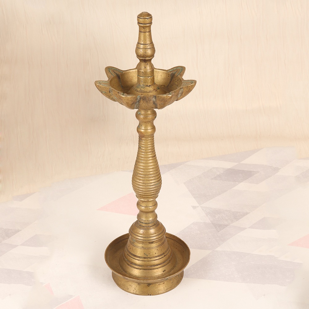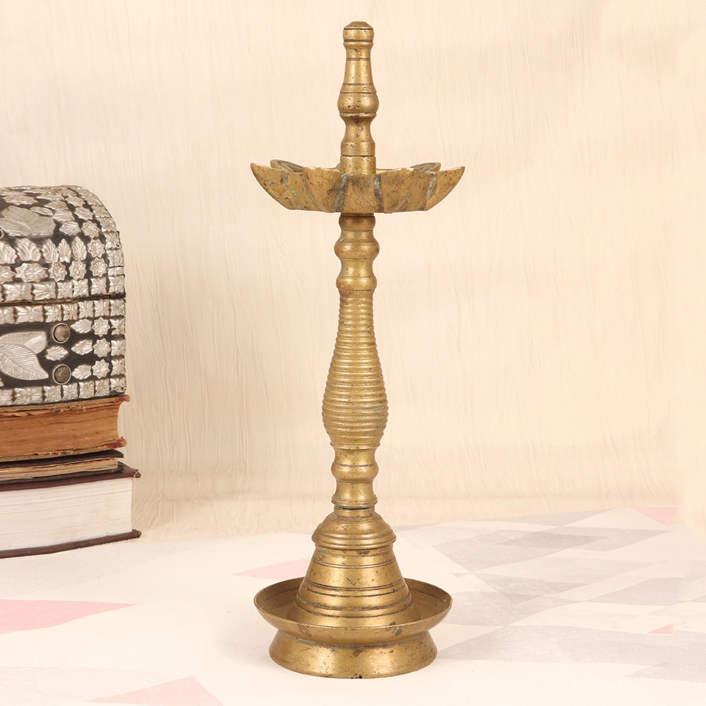 Elevate your living space with the timeless beauty and serene glow of a handcrafted brass oil lamp. Inspired by the rich artistic heritage of South India, each lamp is a unique masterpiece, meticulously crafted by skilled artisans using time-honored techniques. The 7 jyots, or oil reservoirs, allow you to light multiple wicks simultaneously, creating a mesmerizing display of flickering flames that dance and cast a soft, golden light. Whether you choose to burn aromatic mustard oil or nourishing ghee, the natural flame will envelop you in a soothing ambiance - the perfect accompaniment to your daily meditation practice, evening yoga session, or moments of quiet contemplation. With its intricate embossed designs inspired by South Indian tradition, this lamp also makes a stunning decorative piece that will elevate the ambiance of any room. It’s warm, ambient glow will transform your space, creating a serene and inviting atmosphere that promotes relaxation and well-being. Bring the timeless artistry of South India into your home and experience the beauty and tranquility of a handcrafted brass oil lamp. This is a truly special piece that will be cherished for generations to come, infusing your space with the timeless elegance of a bygone era.