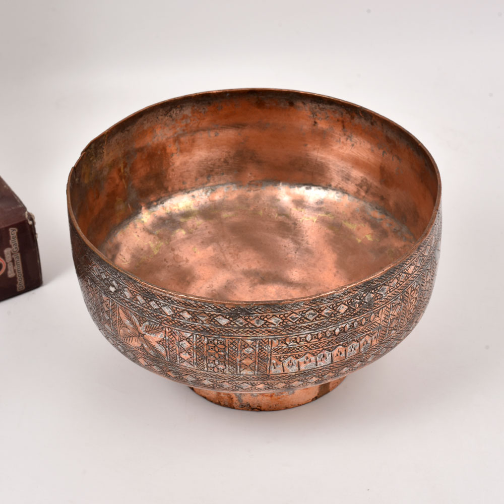 Unlock the allure of timeless Kashmiri artistry with this stunning vintage copper bowl. Meticulously crafted with intricate Islamic-inspired engravings, this piece is a mesmerizing blend of history, culture, and functional beauty. Infuse your home with the enchanting spirit of the East. This vintage copper bowl is more than just a functional piece – it's a work of art that tells a story. Gaze upon the intricate patterns and let your mind wander to the bustling markets and serene landscapes of Kashmir. This stunning bowl is a must-have for the discerning home decor enthusiast or the passionate collector of unique, handcrafted items. Elevate your space with this captivating conversation piece that seamlessly blends timeless elegance and modern sophistication. Invite guests to marvel at the mesmerizing craftsmanship and let this bowl become the centerpiece that sparks endless wonder and delight.