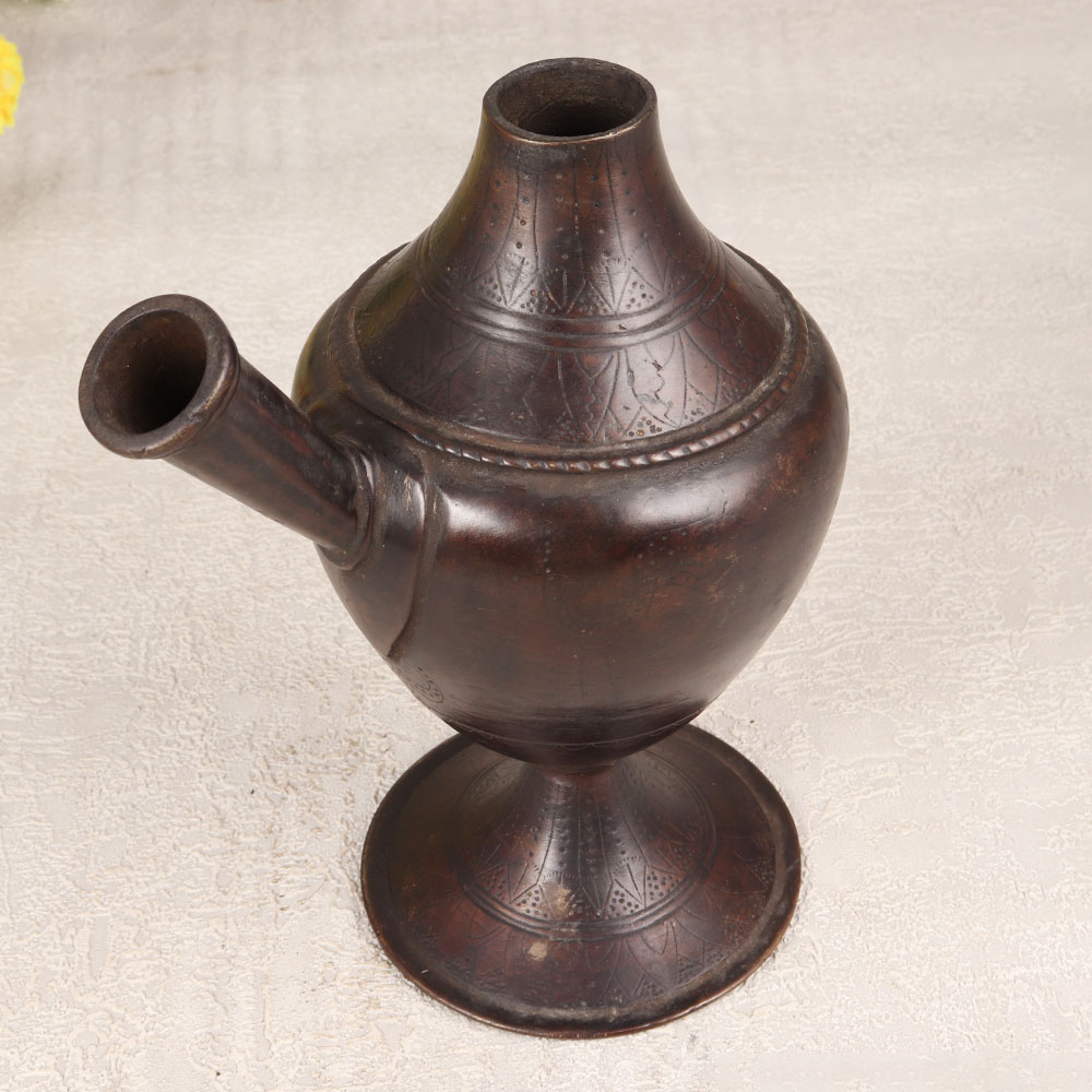 Immerse yourself in the rich cultural heritage of Himalayan Art with this vintage brass hookah base. Handcrafted by highly skilled and experienced Indian artisans, this piece is a testament to the meticulous craftsmanship passed down through generations. The antique dark brown finish adds a touch of nostalgia, creating a stunning visual appeal. The base is adorned with intricate engravings, showcasing the artistry and attention to detail that went into its creation. Crafted from high-quality brass, it exudes a timeless charm that seamlessly blends traditional elegance with contemporary aesthetics. This versatile piece can be displayed in various settings, including homes, offices, restaurants, hotels, or cafes. Transform it into a unique indoor flower pot, infusing your space with both history and natural beauty. This vintage brass hookah base is not merely a decorative item; it's a conversation starter and a valuable addition to any vintage collection. Consider it as a thoughtful gift for your family, friends or relatives on special, festive, or auspicious occasions, sharing the beauty of Himalayan craftsmanship with those close to your heart.
