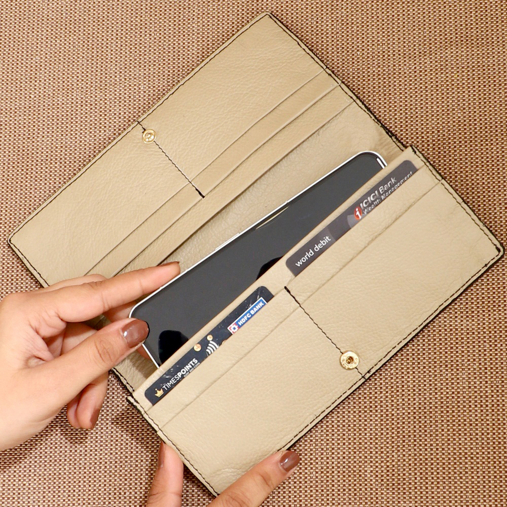 Crafted from amazing Honey Dew leather, it features a snap button closure for secure storage, this sleek wallet features 10 card slots for all your essentials, a currency slot to keep cash neatly tucked away, and even a mobile pocket for added convenience. Made to reflect 's commitment to quality and functionality, Maxie is ideal for women who want an organized yet stylish solution for every occasion. Features Snap Button Closure 1 currency slot 1 mobile pocket 10 card slots Elegant Microsuede lining in Beige Handmade & Handcrafted Size: S About the Leather Honey Dew An elegant pebble leather, soft to touch and has a matt finish. As the name suggests its color falls under the pastel green family, it has a very calming feel. Regular cleaning and conditioning using leather cream will boost its life! Care Instructions To increase the longevity of your product, we advise: Avoid exposure to rain Apply leather cream as per usage Store it in waterproof dustbag Origin: Made in India, safely packed and quality checked by Indianshelf.