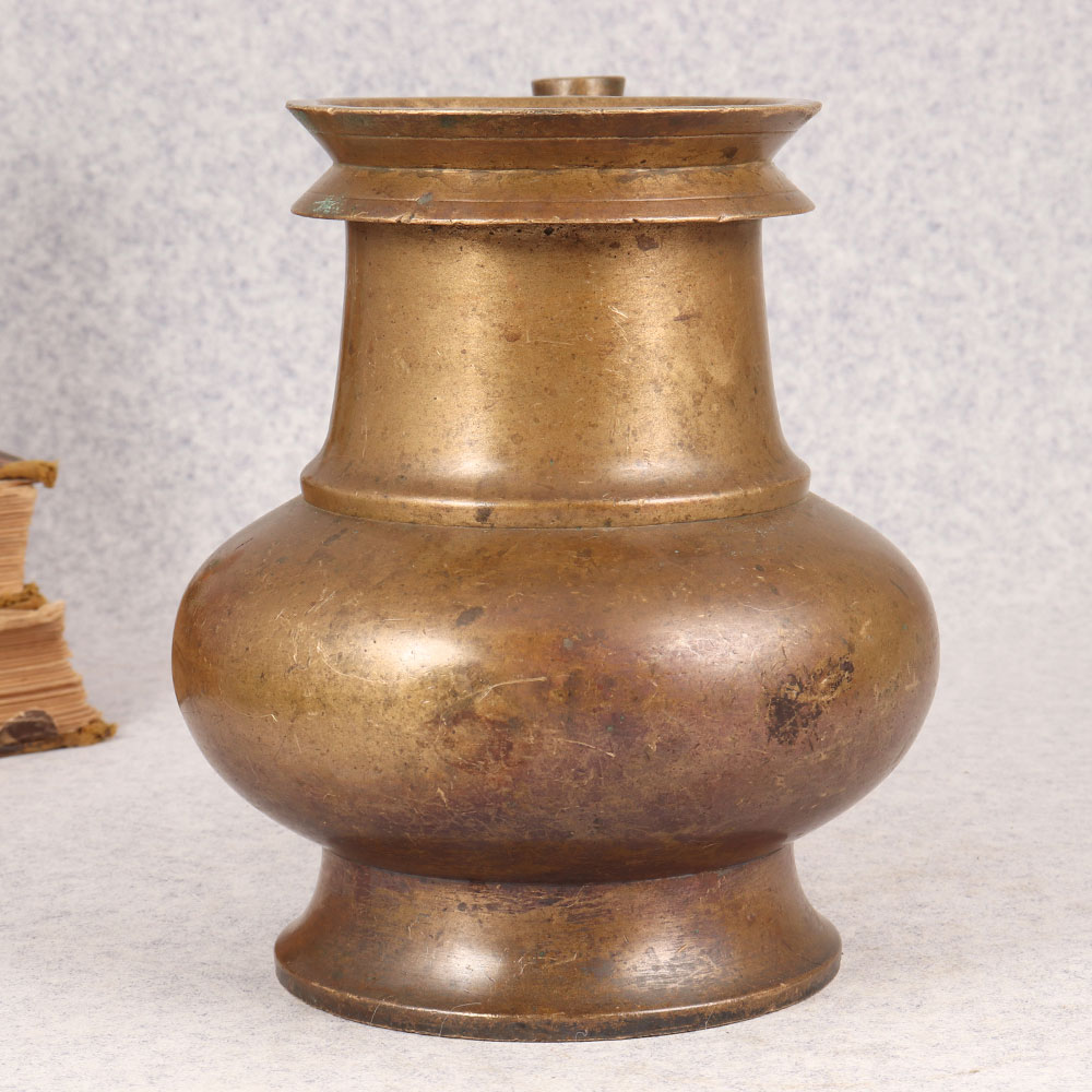 Buy a Vintage Brass Sagar Water Pot with Spout online that is a cherished artefact handmade by talented Indian artisans. This exquisite piece, adorned with an antique brown finish, resonates with the spiritual essence of ritual and prayer at temples. Fashioned from high-quality brass, it exudes authenticity and craftsmanship, embodying the rich traditions of Indian artistry. This sagar water pot serves as a captivating focal point for your home, office, restaurant, hotel, or cafe prayer room, adding a touch of divine elegance to any setting. Beyond its religious significance, this piece transcends functionality, doubling as a captivating decorative element. Its versatile charm makes it a prized addition to vintage collections and an ideal gift for your family, friends or relatives on special, festive, or auspicious occasions. As you place this antique brass sagar water pot in your sacred space, feel the spiritual energy it brings, echoing the heritage of Indian craftsmanship.