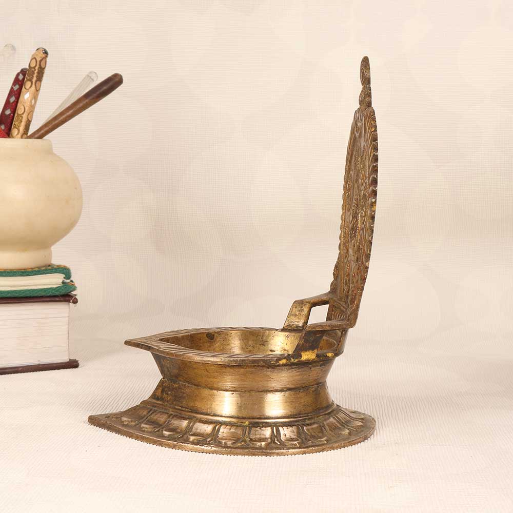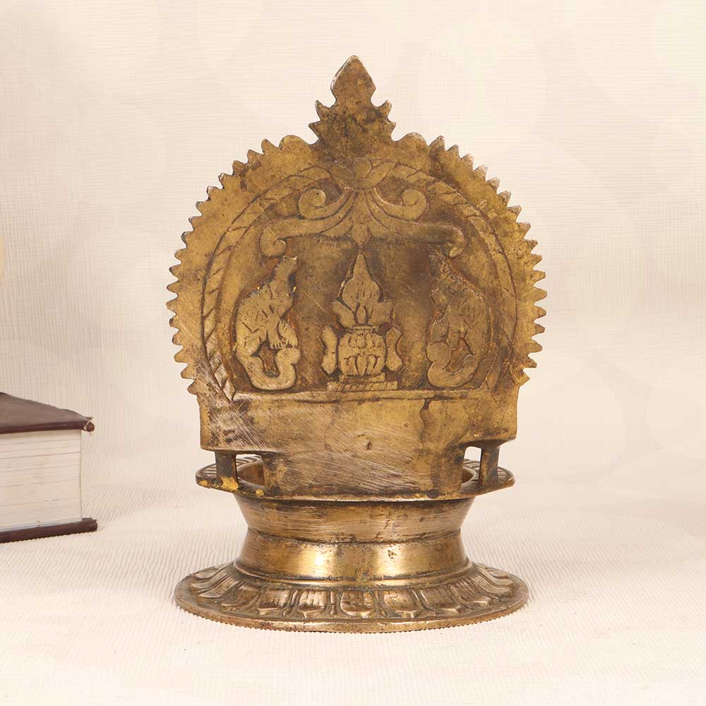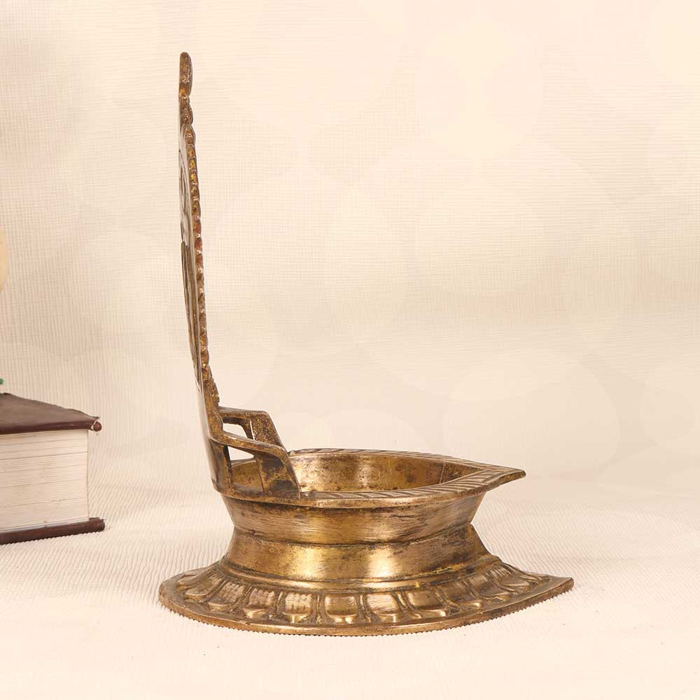 Bask in the divine glow of this vintage brass Gajlaxmi lamp, intricately casted in the style of traditional South Indian artistry. This beautiful lamp features the detailed figure of Gajlaxmi, the Hindu goddess of fortune, prosperity and well-being. Create a sacred space for spiritual reflection with the soft, natural glow of this lamp's flame. The lamp makes a meaningful gift for any occasion - housewarmings, birthdays, weddings - to impart blessings upon the receiver. With its elegant, divine imagery, this handcrafted lamp will be an eye-catching focal point and conversation starter.