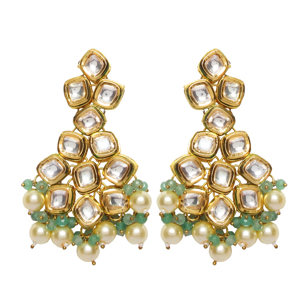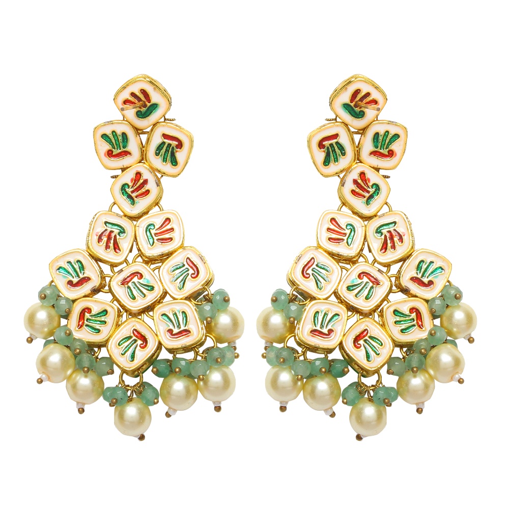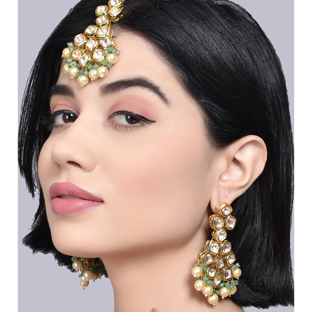 Graceful and intricately layered, this handcrafted chandelier earring and maang tikka set blends traditional elegance with soft contemporary tones. Designed with square-cut mirror stones arranged in a cascading formation, the set is finished with ivory pearls and mint-toned bead accents that add movement and depth. Earring & Maang Tikka Highlights Entirely handcrafted, this set reflects refined artisan skill with balanced proportions and fluid detailing. Chandelier-style earrings with tiered mirror stone layout Ivory pearl clusters paired with mint green bead accents Coordinated handcrafted maang tikka for a complete look Lightweight construction for comfortable extended wear Traditional craftsmanship with modern colour harmony Specs & Materials Material: Metal alloy with mirror-style stones and bead detailing Colour: Soft gold with ivory pearls and mint accents Design: Cascading chandelier earrings with matching maang tikka Origin: Handmade in India and individually quality-checked Natural variations occur due to handcrafted workmanship Styling & Gift Inspiration Perfect for weddings, mehendi ceremonies, and festive occasions Pairs beautifully with pastel lehengas, sarees, and fusion wear An elegant gift choice for bridal trousseaus and celebrations Adds softness and sophistication to statement styling Care Guide Store in a dry pouch and avoid moisture, perfume, or harsh chemicals. Clean gently with a soft cloth after use to preserve shine and detailing. Artisan Craftsmanship This jewellery set is fully handcrafted using time-honoured techniques. No machines are used, ensuring each piece carries its own unique artisanal character.