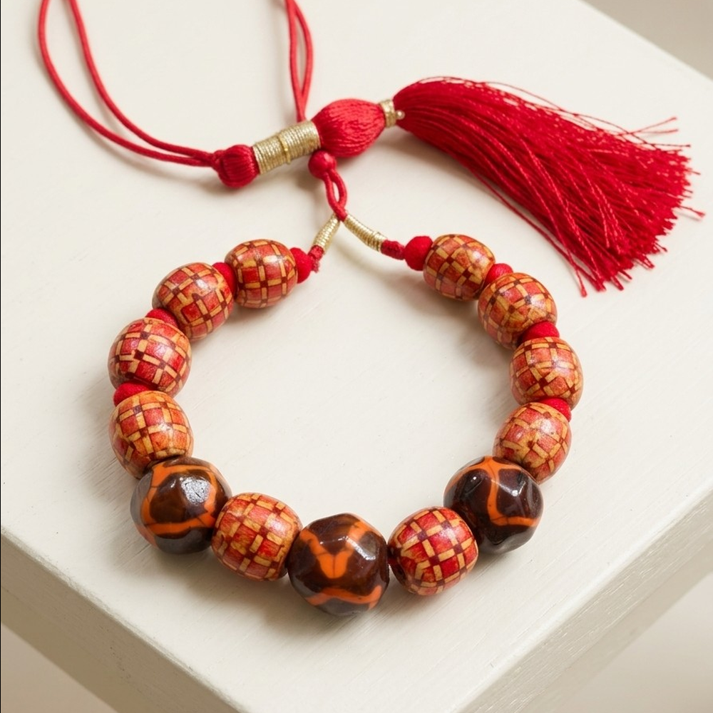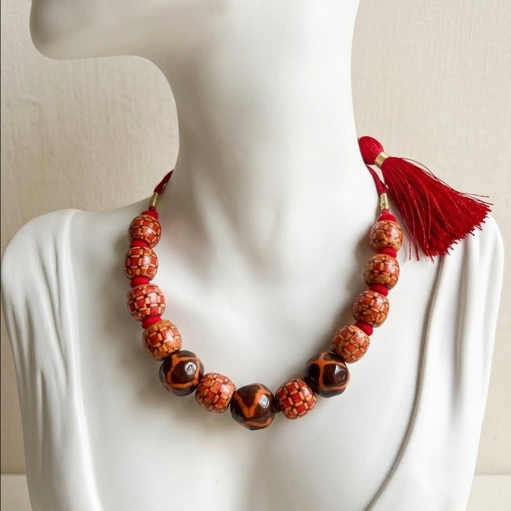 This Handcraftedjewelry wooden bead crystal necklace is designed to create a bold and artistic statement. Featuring a combination of circular wooden beads and rich red crystal accents, this necklace brings together traditional craftsmanship with contemporary styling. Distinctive Bead Combination The mix of polished wooden beads and vibrant red crystal elements creates a visually striking contrast. Natural wooden bead structure Handcrafted red crystal detailing Balanced color composition for standout appeal Handcrafted Jewelry Appeal Each necklace reflects detailed handwork, ensuring a unique and artisanal finish. Carefully assembled by skilled artisans Traditional craftsmanship with modern design Unique variations in every piece Statement Styling Accessory This necklace enhances both ethnic and fusion outfits with a bold, elegant presence. Perfect for festive and casual wear Pairs well with sarees, kurtas, and dresses Eye-catching centerpiece design Comfortable Wear Design Designed for ease and comfort while maintaining a premium handcrafted look. Lightweight structure for long wear Secure and adjustable dori closure Skin-friendly materials This Handcraftedjewelry wooden bead crystal necklace is an ideal choice for those who appreciate artistic accessories and handcrafted elegance in everyday styling.