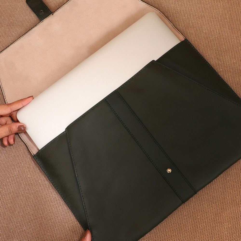 Crafted with gorgeous Jungle leather, it features a sleek knob stud flap closure, The Envelope offers easy access to your laptop while keeping it securely stored in the main compartment. Its slim, minimalist design makes it ideal for slipping into a larger bag or carrying on its own, exuding a polished, professional look.