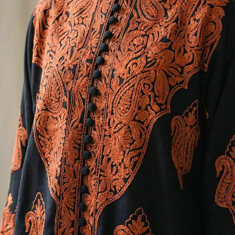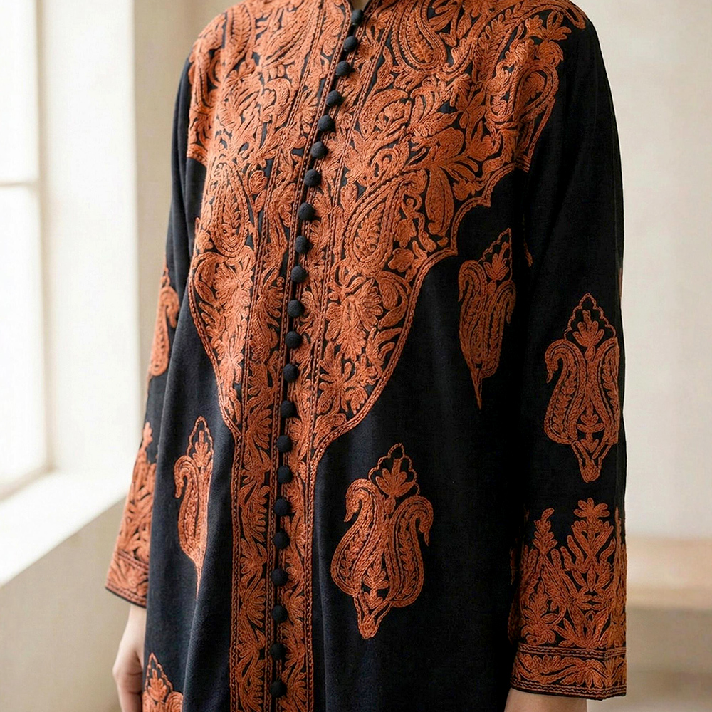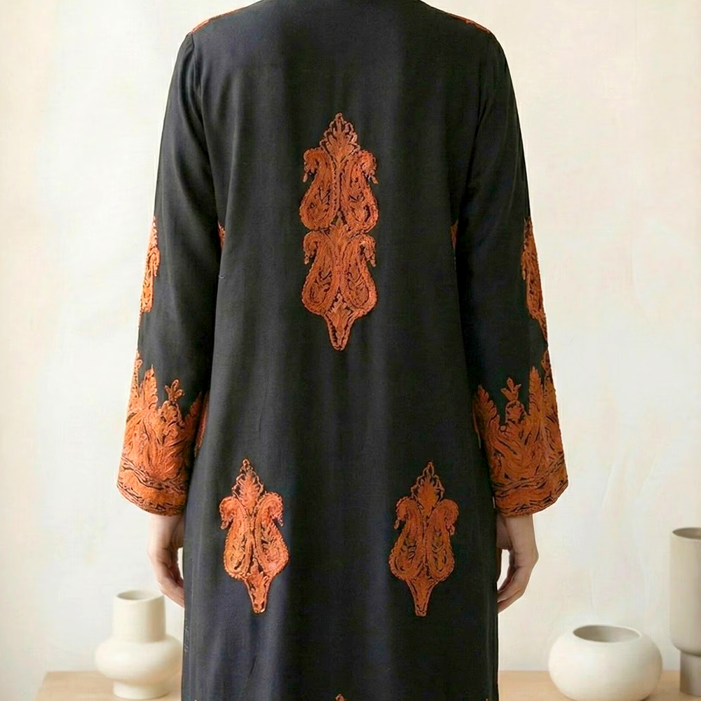 Step into timeless elegance with this handcrafted Kashmiri cotton embroidered kurta set, designed to reflect the rich textile heritage of Kashmir. Crafted on a deep black cotton base, the kurta is adorned with intricate traditional Kashmiri-inspired embroidery in warm rust and earthy tones, creating a striking contrast that feels regal yet understated.