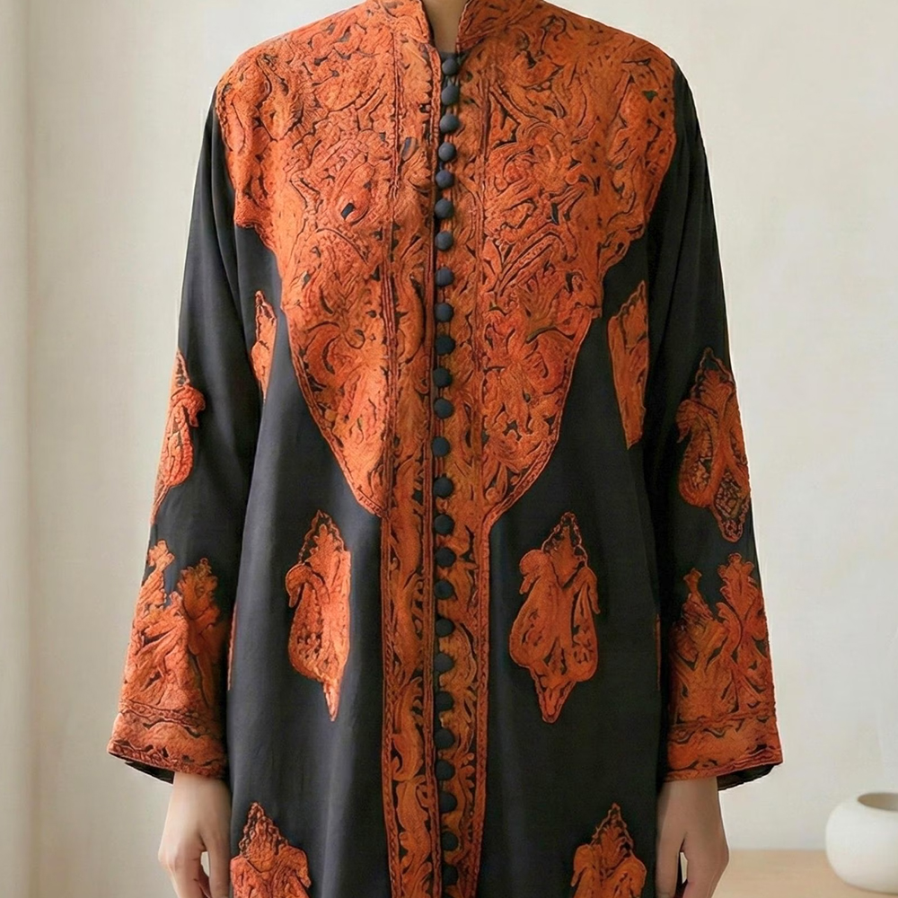 - Colour: Black base with rust and earthy-toned embroidery