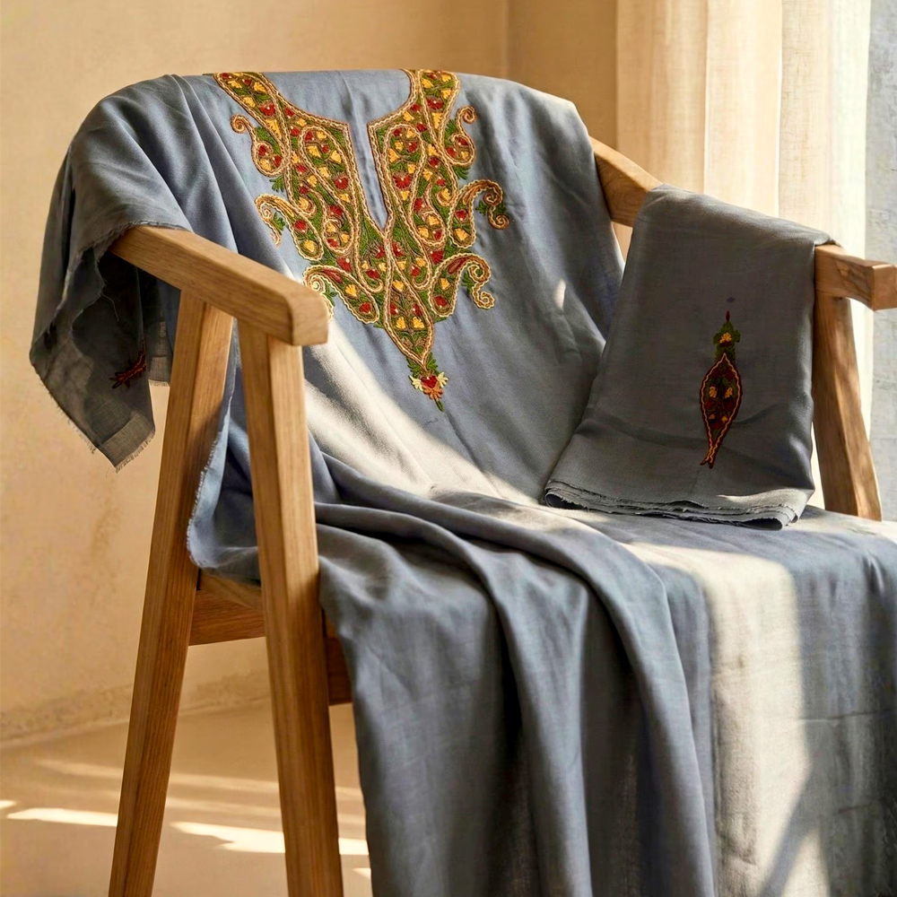 Rooted in Kashmiri craftsmanship, this hand-embroidered cottonviscose kurta set brings together understated elegance and traditional artistry. The soft grey base is elevated with intricate paisley and floral embroidery along the neckline and sleeve accents, creating a refined balance between everyday wearability and heritage detail.