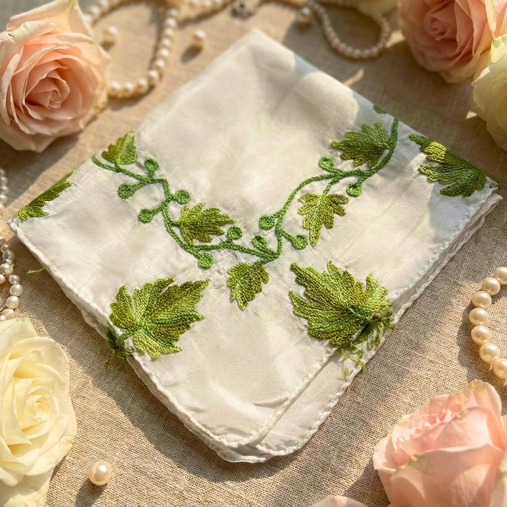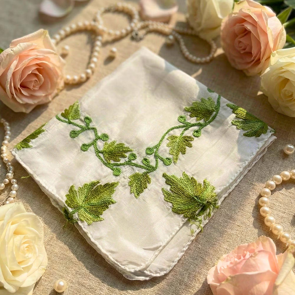 This silk handkerchief is created by Kashmiri artisans who continue generations-old embroidery traditions. Each piece is handcrafted, never mass-produced, celebrating precision, patience, and the enduring beauty of Kashmiri craftsmanship.