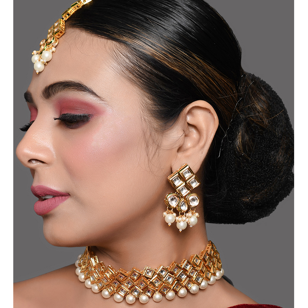 The Handcrafted Lattice Mirror Stone Pearl Choker Necklace Set with Earrings and Maang Tikka is designed to bring refined symmetry to bridal and festive styling. Crafted in polished golden brass, the choker features a delicate lattice arrangement highlighted with luminous mirror stones and pearl accents. The coordinated earrings and maang tikka complete the ensemble, creating a harmonious head-to-neck adornment. Compact yet intricate, this 6-inch set embodies traditional Indian craftsmanship with graceful modern elegance.