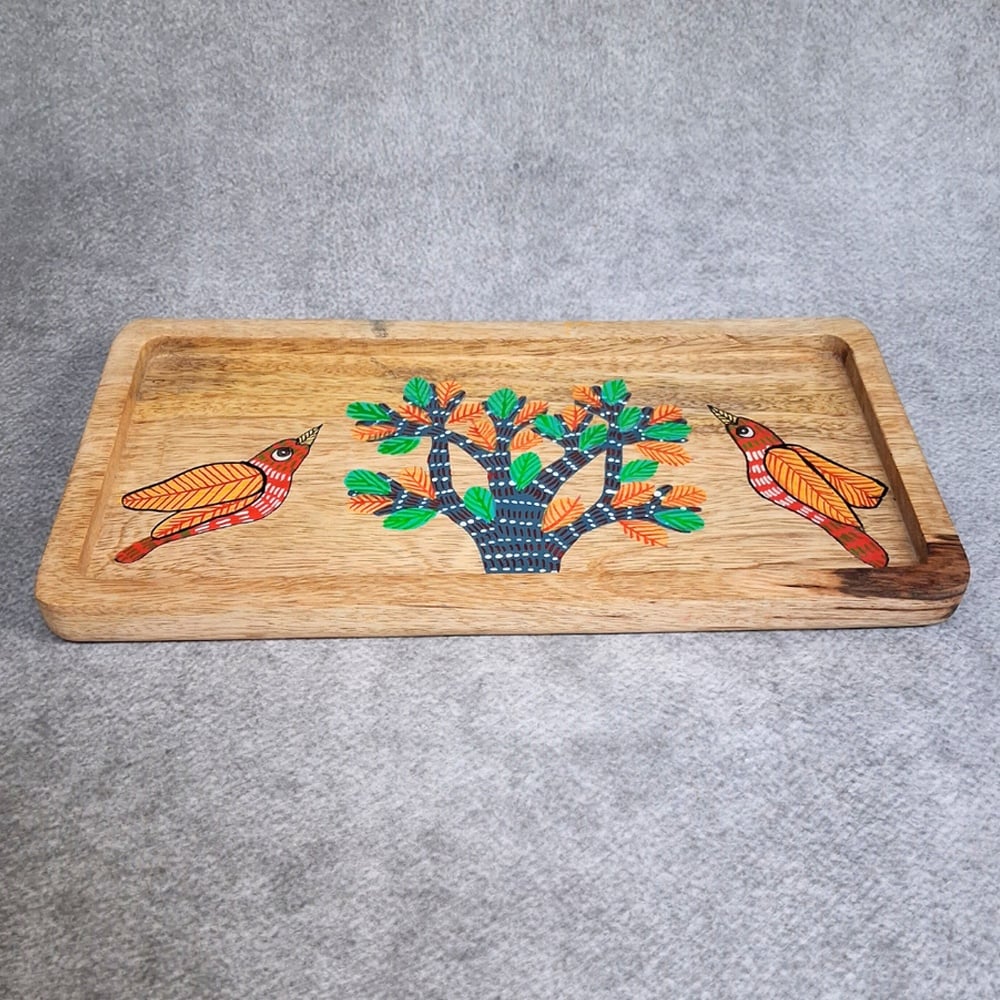 The hand painted birds and tree motif adds a vibrant and storytelling element, making the tray visually engaging and unique.