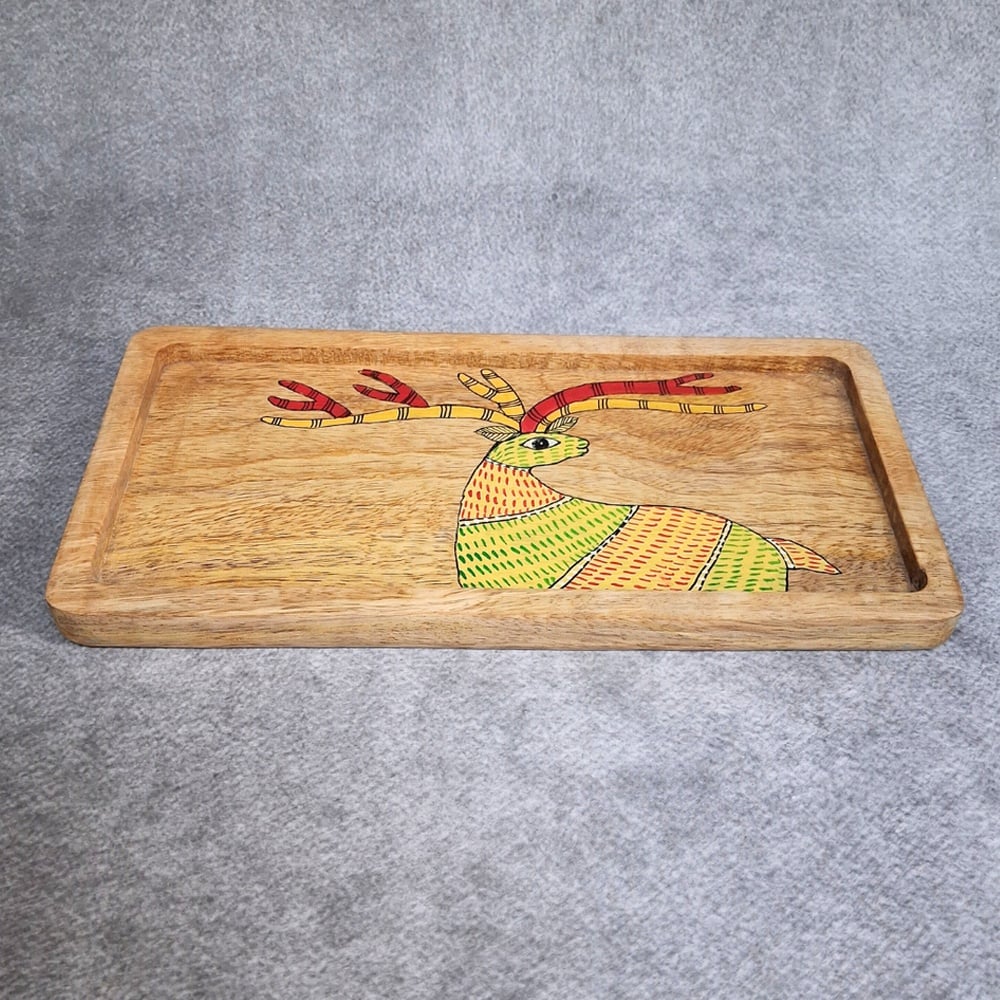 This handcrafted mango wood deer hand painted tray combines artistic expression with everyday functionality. Featuring a beautifully detailed deer motif with vibrant antlers, this tray adds a natural and decorative charm to your serving and display needs.