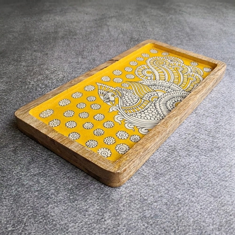 This handcrafted mango wood hand painted tray blends functional design with artistic detailing. Featuring a vibrant hand painted surface set within a sturdy wooden frame, this tray brings color, craftsmanship, and utility together in one elegant piece.