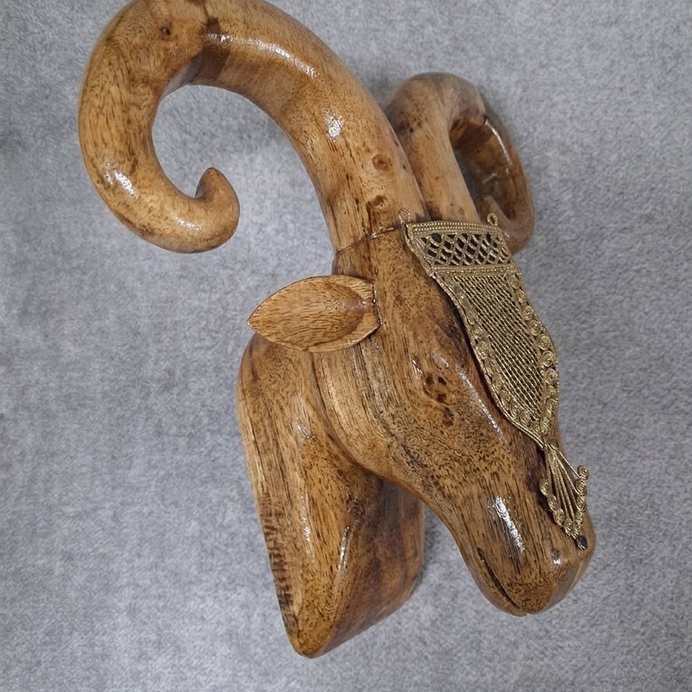 This handcrafted mango wood ram head wall decor combines bold artistic form with traditional craftsmanship. Featuring a finely carved ram head made from seasoned mango wood and accented with a handcrafted brass accessory, this piece creates a striking and sculptural statement for modern interiors.