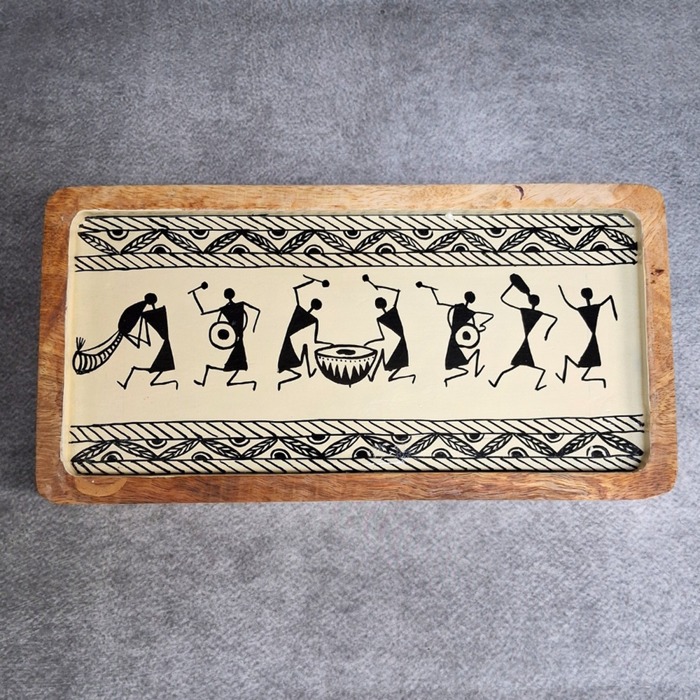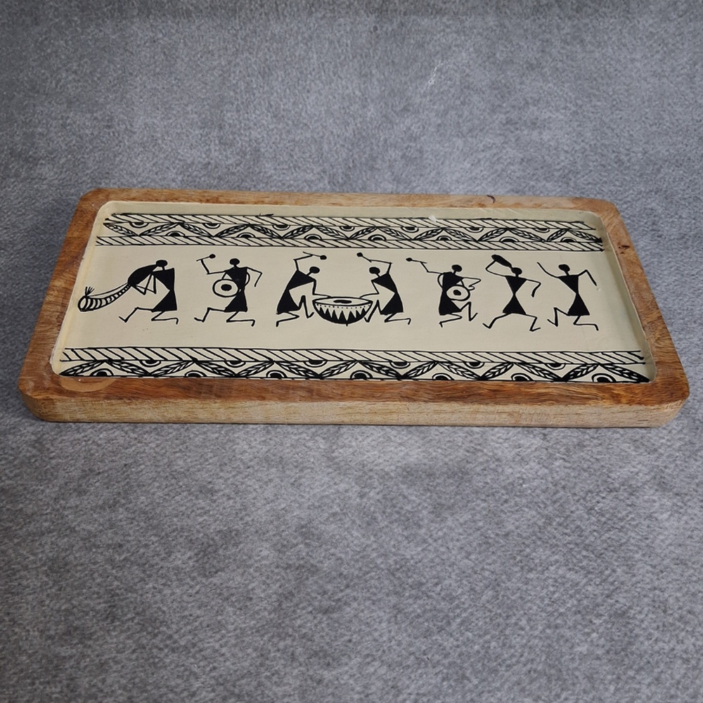 The tribal Warli artwork adds a cultural and artistic touch, making the tray a unique statement piece.