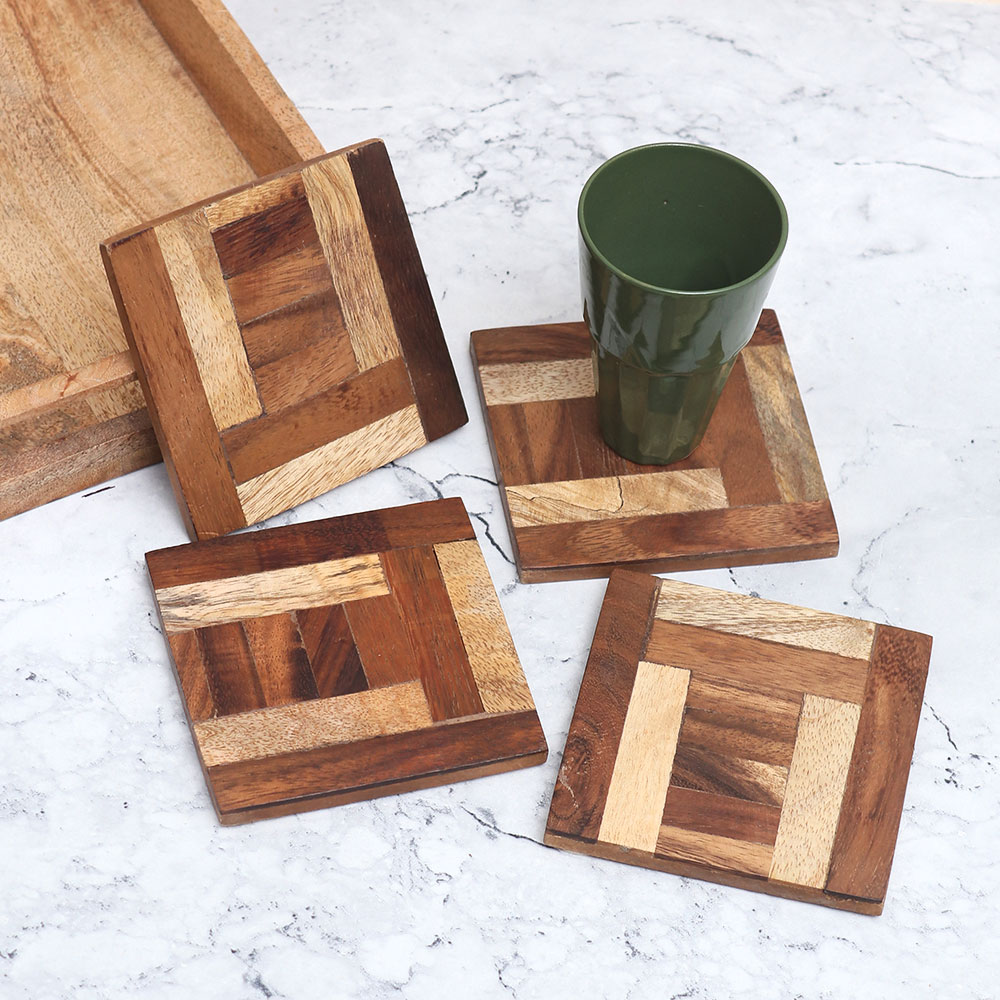 This Pack of 4 wooden coasters is handmade with meticulous precision by highly skilled craftsmen from India. These coasters are a true embodiment of elegance and functionality. Made from premium-quality wood, each coaster boasts a sturdy square shape that exudes timeless charm. With their antique brown finish pattern, these coasters not only serve as practical accessories but also double as stunning decorative pieces for your home or office. They add a touch of sophistication to any surface they grace. Our wooden coaster set is designed to safeguard your furniture from unsightly stains caused by water rings, tea spills, juice splatters, or coffee drips. They are perfect for use in homes, offices, restaurants, hotels, and cafes. These handcrafted coasters also make for an exceptional gift choice for your loved fours on special or festive occasions. Whether it\'s a housewarming party or a birthday celebration, our wooden coaster set will leave a lasting impression. Indulge in the beauty and functionality of the best wooden coaster set on the market.