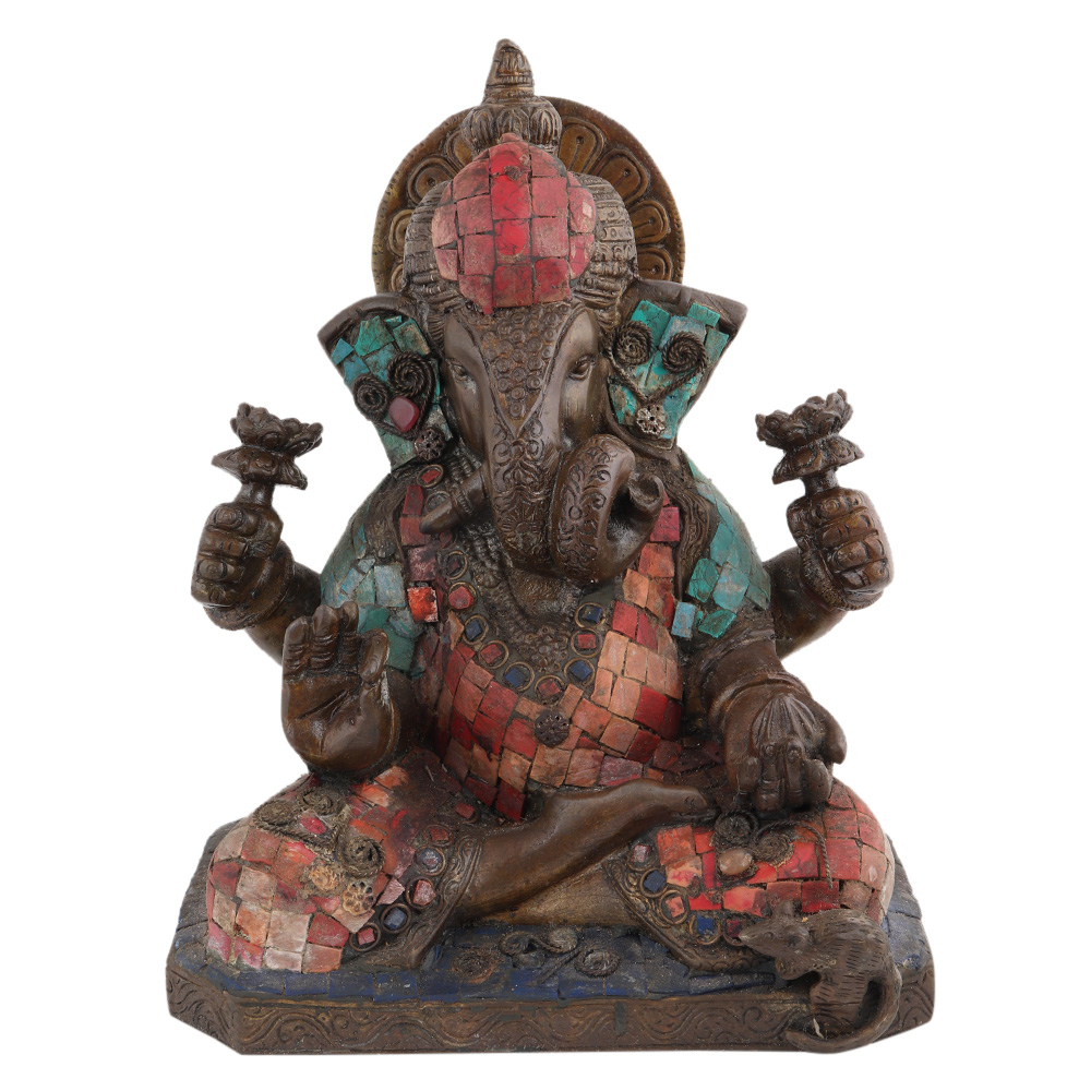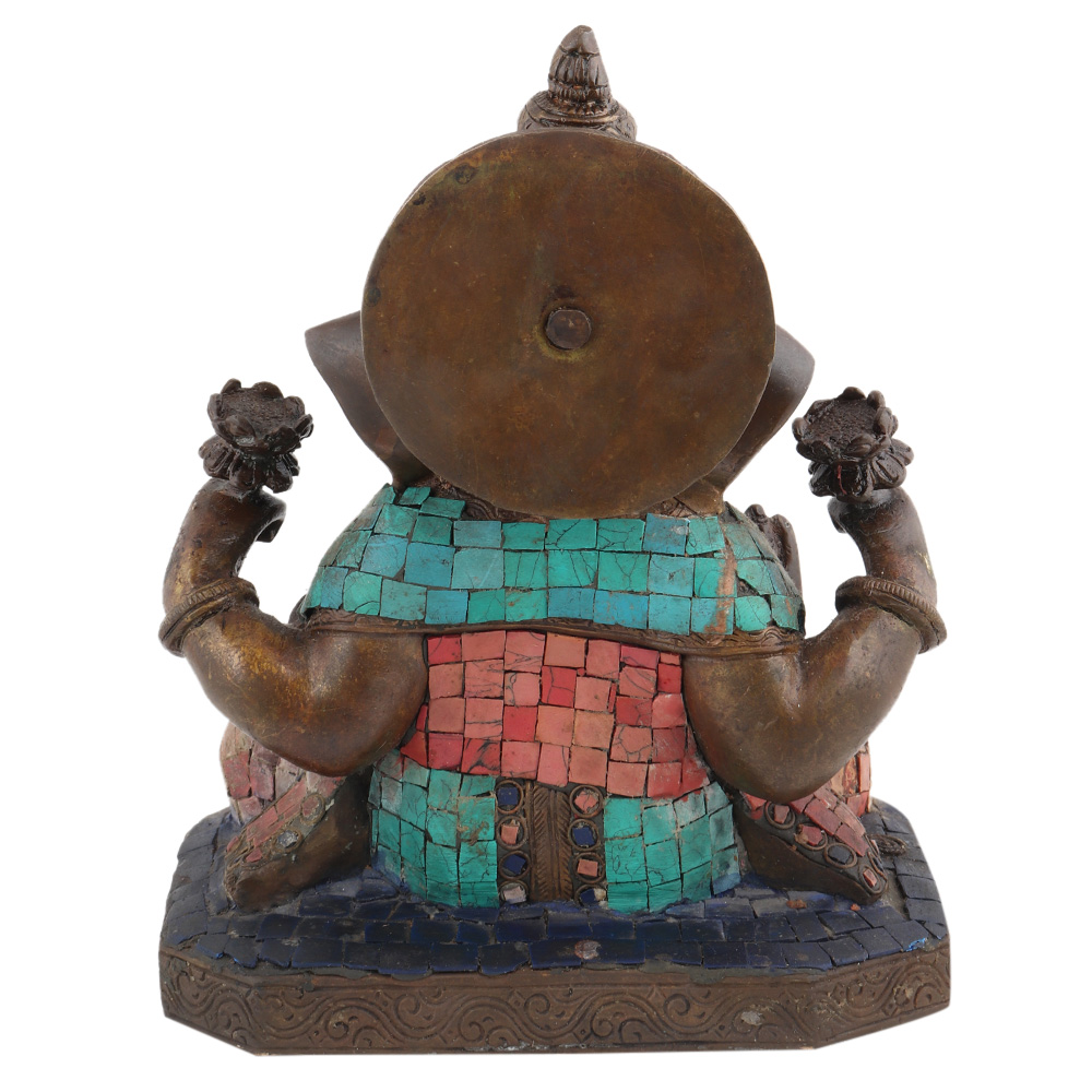This gorgeous brass sitting lord Ganesha statue with teal and red stone inlay work makes it the perfect home, office, and hotel decoration item. An ideal wedding gift, Diwali, and spiritual gift for your loved ones.