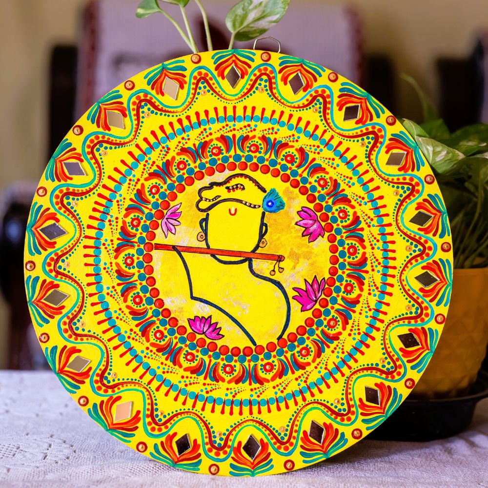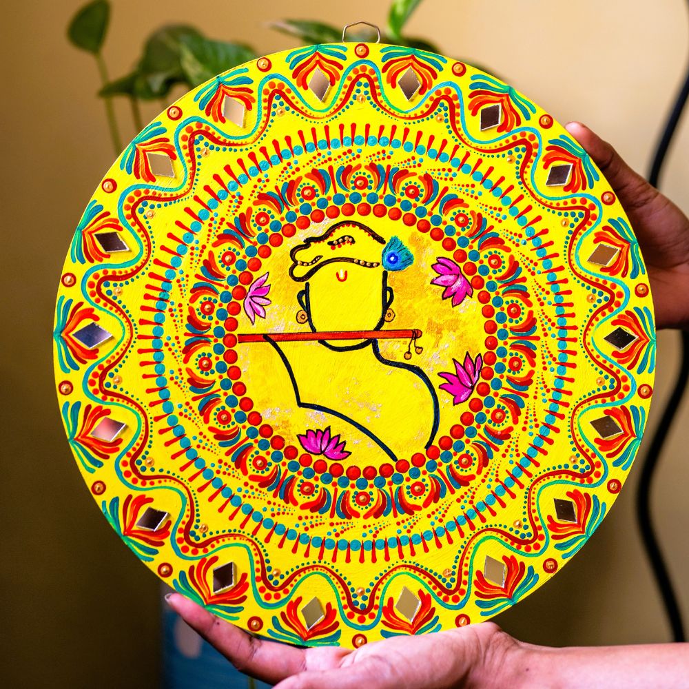 This vibrant Murlidhar Mandala captures the joyous spirit of Lord Krishna through lively colors and playful artistic flow. Handpainted on high-quality MDF, the artwork blends spirituality with nature-inspired motifs, creating a warm, uplifting aura in any room. Packed and quality checked by Indianshelf.