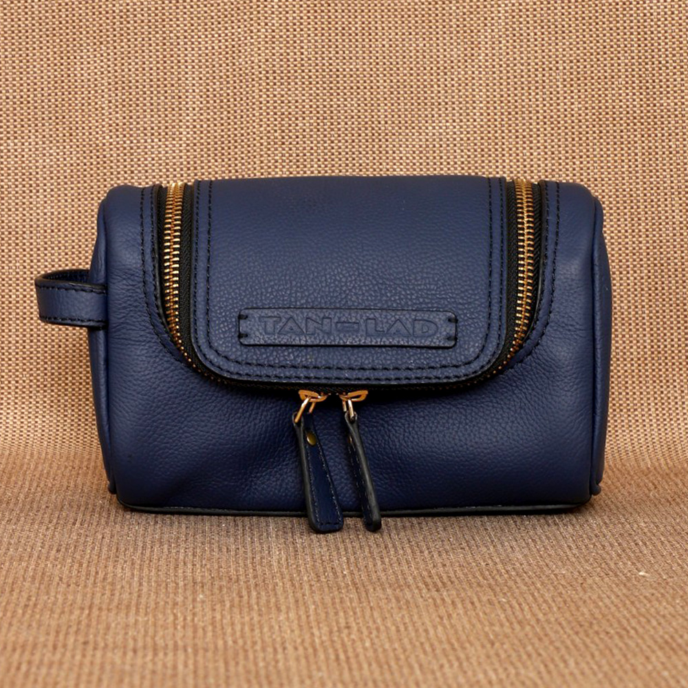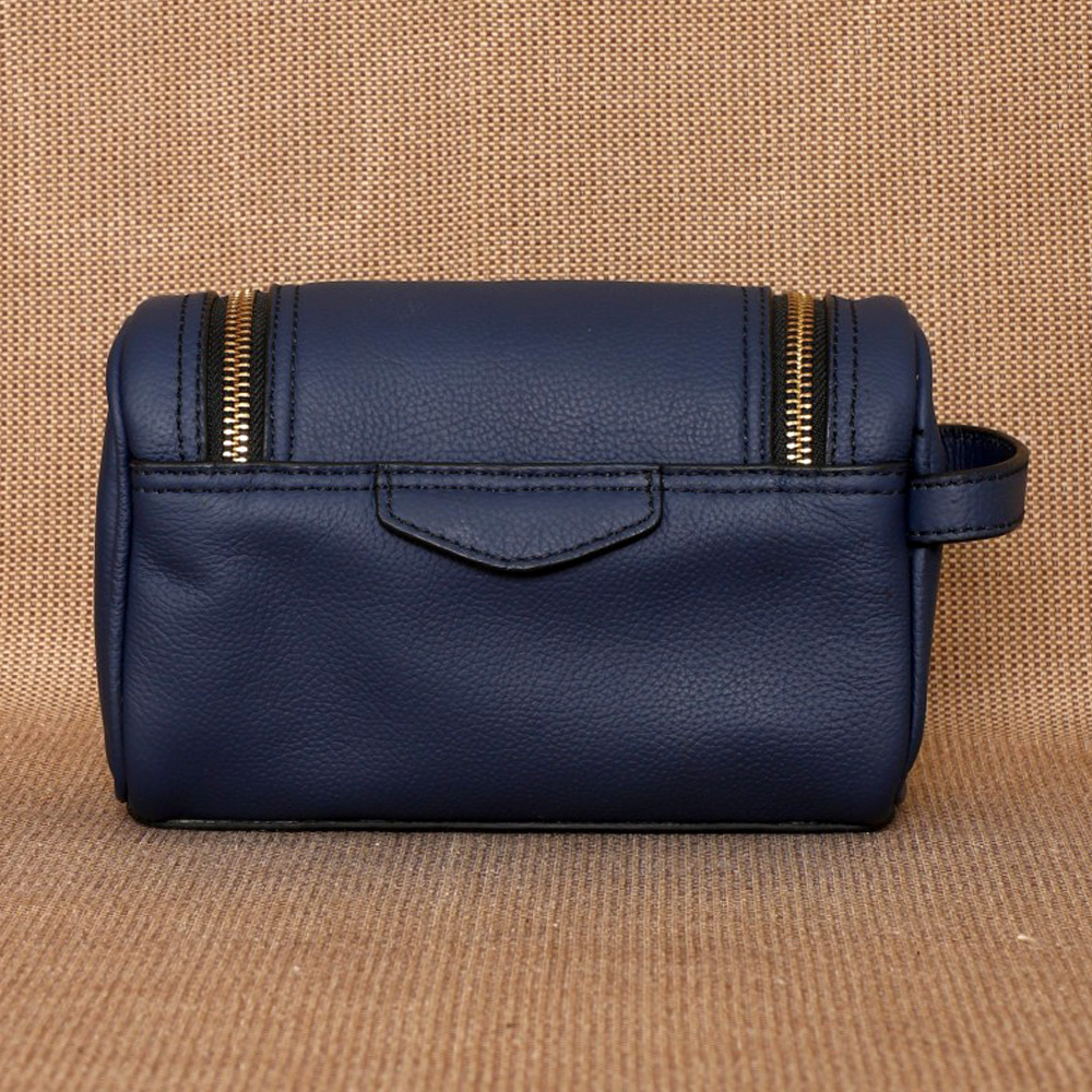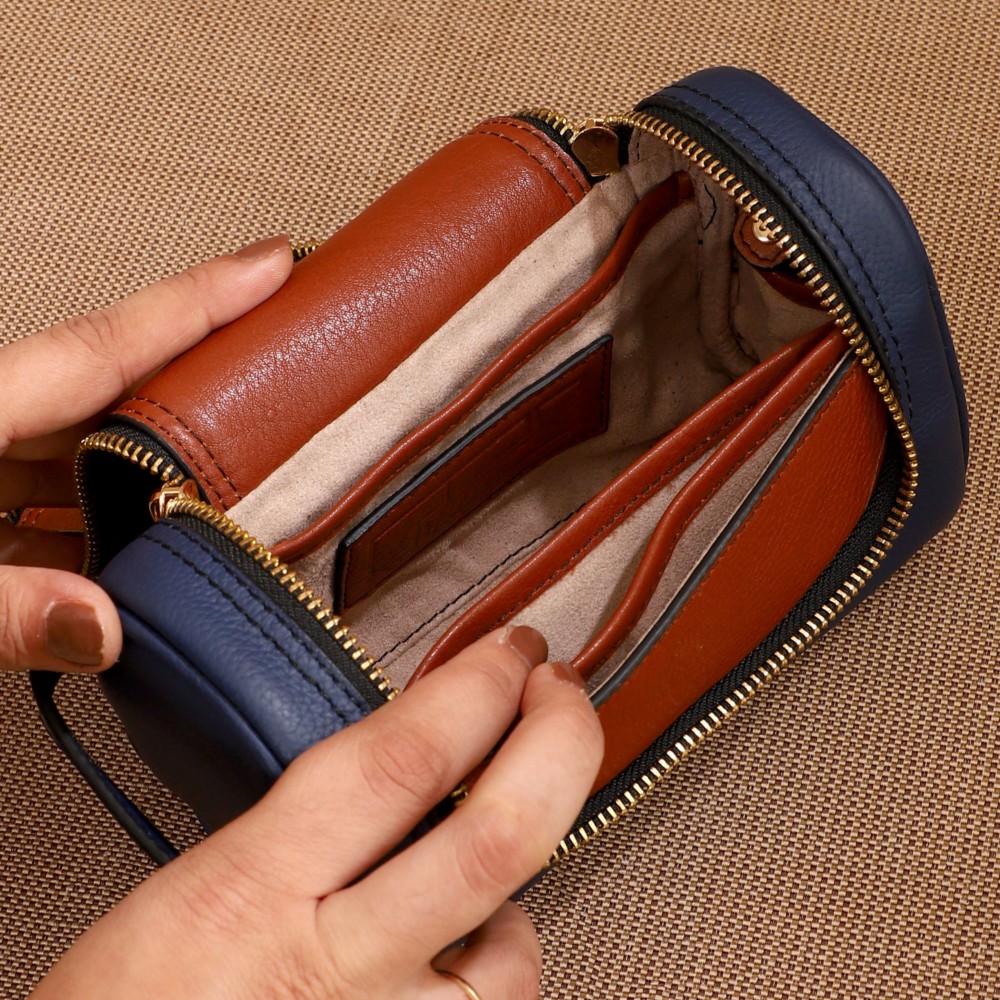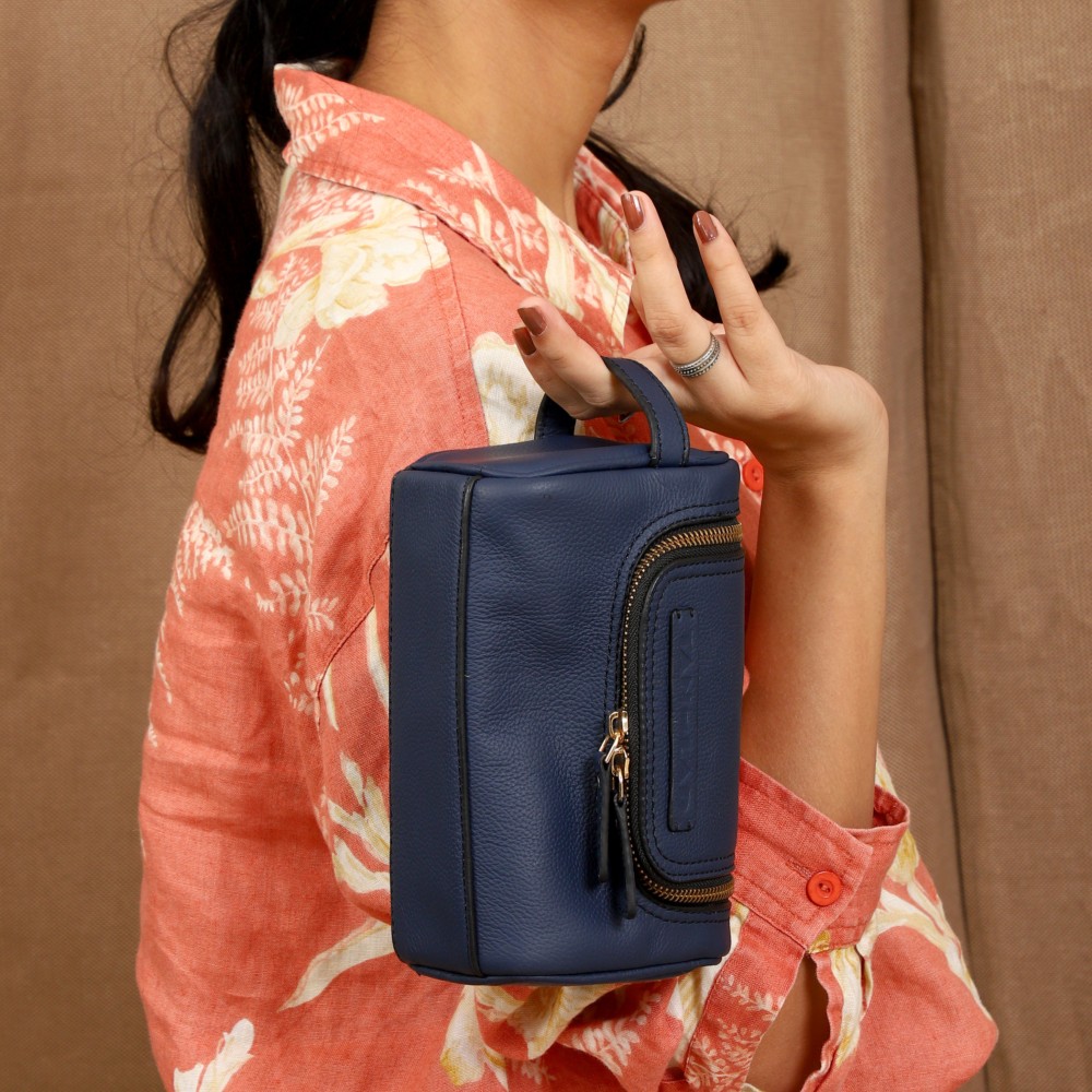 Crafted from gorgeous Navy and Sienna leather, it features a 2-way zipper closure and a convenient carry handle on the side, Jill is easy to grab and go, whether you're packing for a weekend getaway or keeping your toiletries and travel accessories sorted. Under the flap, theres an open pocket on the front panel, ideal for quick access to items like your grooming essentials.