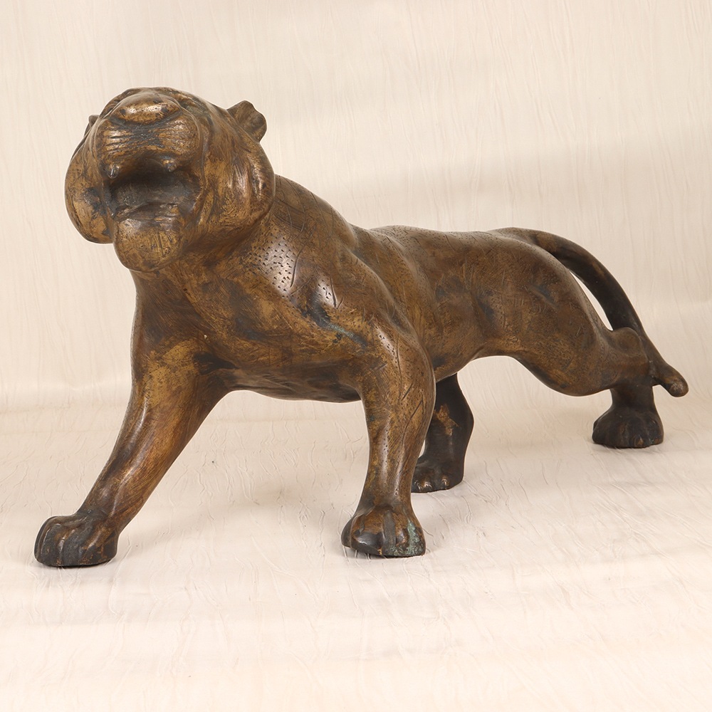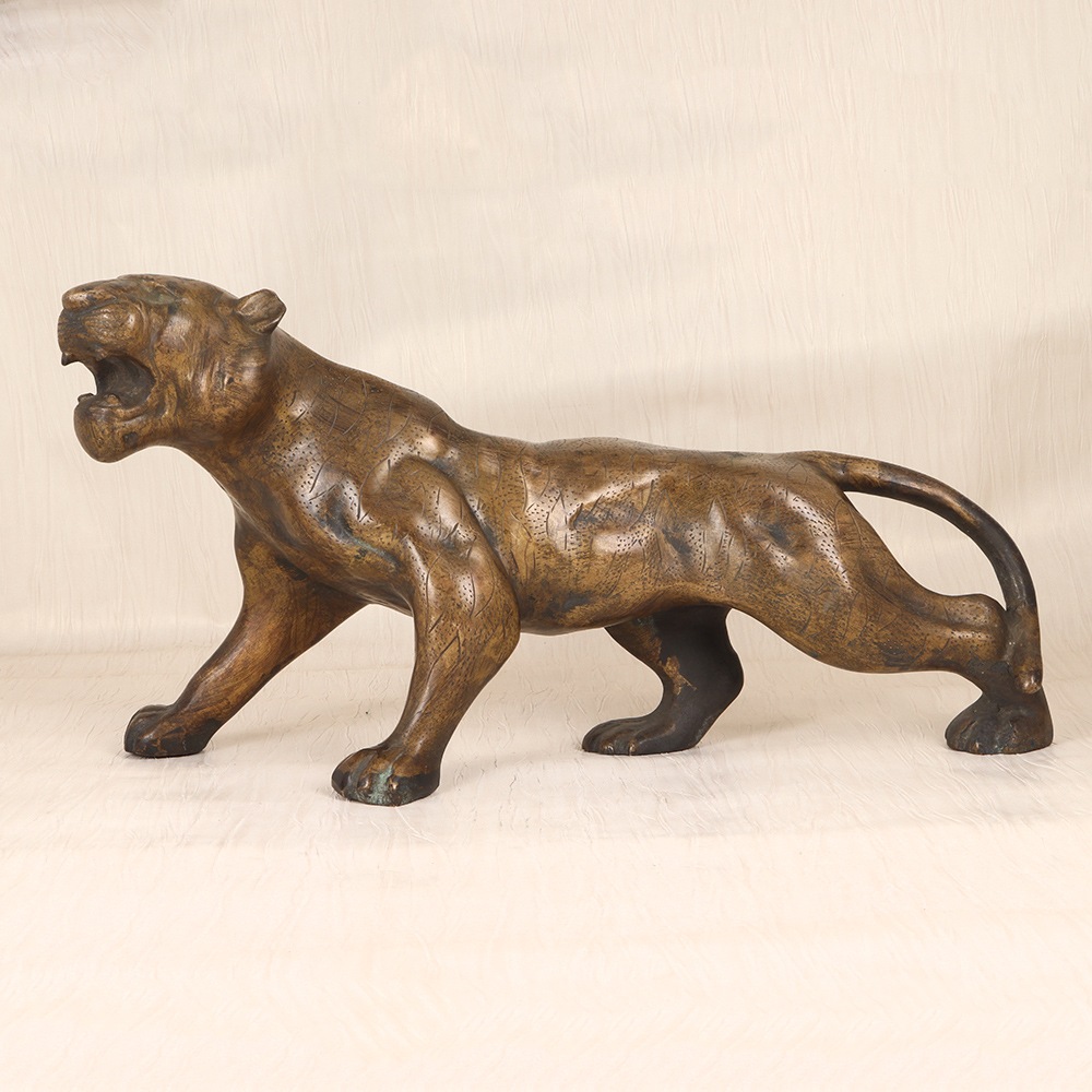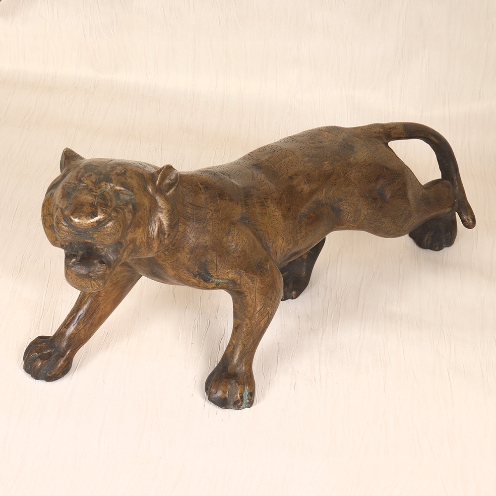 Unleash the wild, primal energy of the jungle in your living space with this stunning pair of vintage brass tiger statues. Meticulously crafted with an eye for detail, each statuette captures the fierce, graceful spirit of these magnificent felines through intricate engraving and a lustrous brass finish that radiates an aura of adventurous, untamed beauty. These brass tigers are more than just decorative accents - they're sculptural works of art that infuse your home with the wild, primal energy of the jungle. Display them prominently on a mantel, bookshelf or entryway table to instantly command attention and transform your space with a sense of adventurous, regal elegance. Whether you're drawn to the raw power of exotic wildlife or simply seek to surround yourself with objects of exceptional craftsmanship, this vintage brass tiger statue pair is an investment that will captivate and inspire for years to come. Bring the majestic, untamed essence of the tiger into your world and make these regal felines the centerpiece of your home decor.