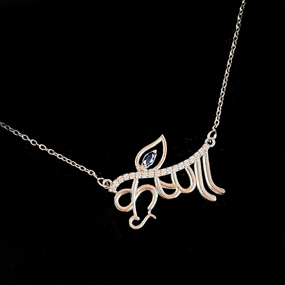 This handcrafted sterling silver pendant with chain features a graceful script inspired by Lord Krishnas divine presence. The flowing contours and symbolic leaf detail create a refined spiritual form that rests elegantly along the neckline. Designed for devotees and lovers of meaningful jewellery, this pendant blends devotion with contemporary craftsmanship. Each piece is carefully shaped and finished by hand. Packed and quality checked by Indianshelf.