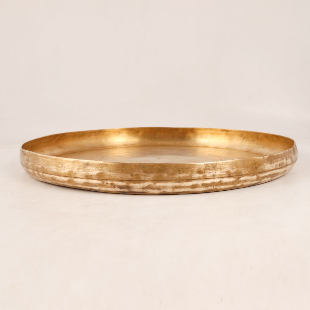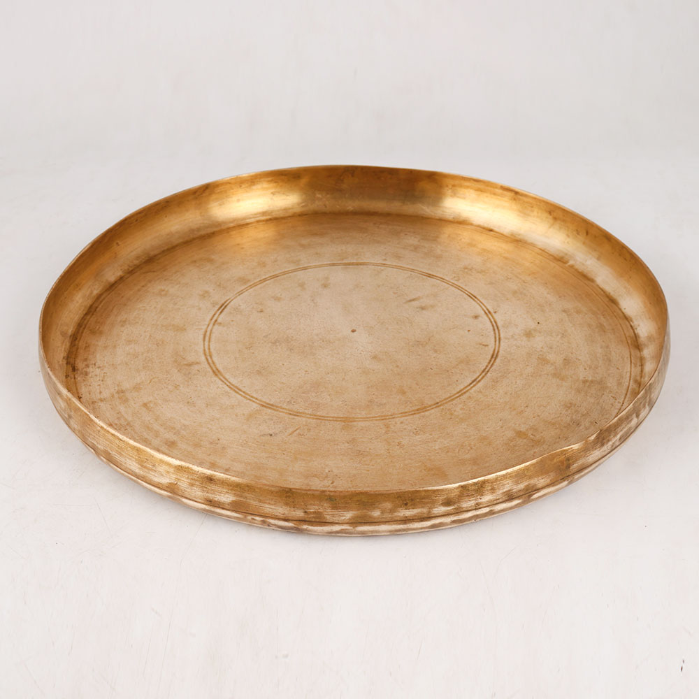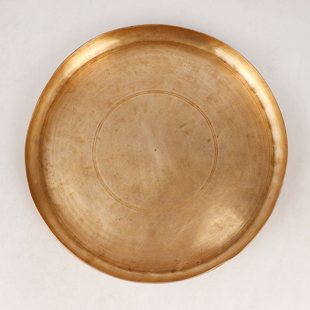 Experience the timeless allure of our exquisite Bell Metal Plate or Thali, a true embodiment of artistry and craftsmanship. Handmade by talented Indian artisans hailing from the enchanting land of Himachal Pradesh, this plate resonates with history and tradition. Made from high-quality bell metal, its antique golden finish imparts an aura of vintage grandeur. Originally designed for serving food, this plate now stands as a symbol of heritage and charm. Its intricate detailing and graceful curvature evoke a sense of nostalgia, perfect for adorning your living space, office, restaurant, hotel, or cafe. While its culinary purpose has evolved, its beauty remains everlasting. Whether gracing an exhibition or nestled within a vintage collection, this bell metal plate narrates a story of cultural opulence. As a thoughtful gesture, it makes for an exceptional gift on special, festive, or auspicious occasions, allowing you to share the elegance of tradition with your family, friends or relatives.