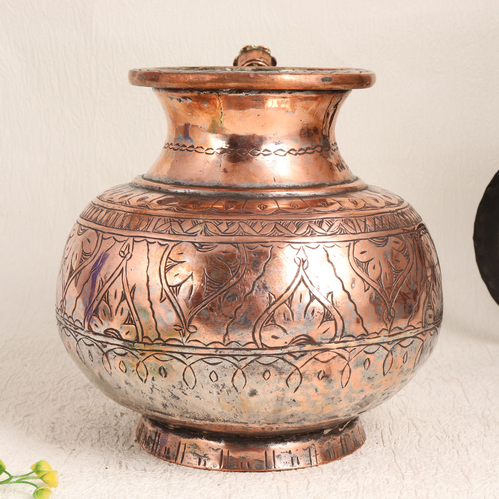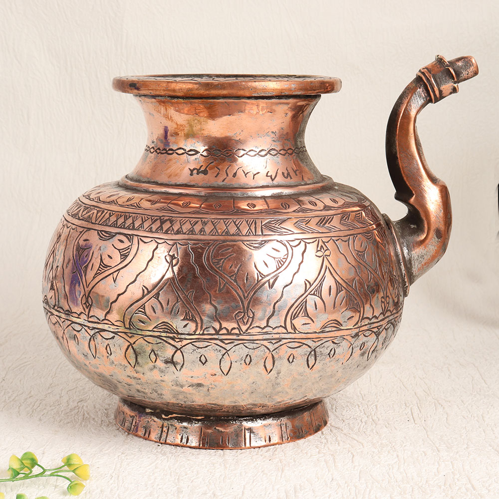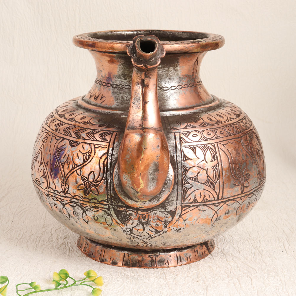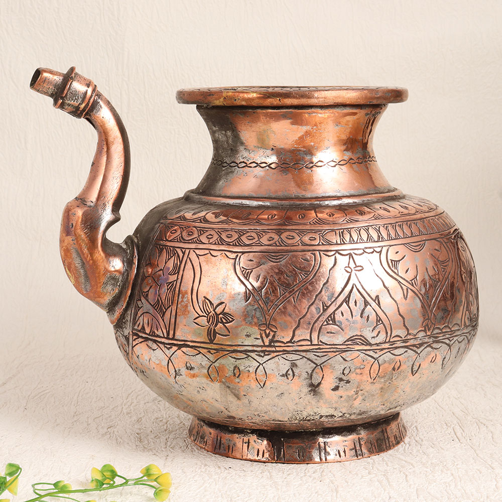 This Vintage Copper Holy Water Pot is a true masterpiece of Islamic Artistry. Handcrafted with meticulous attention to detail by talented artisans, this piece showcases the rich heritage of craftsmanship that dates back centuries. Made from high-quality copper, this pot boasts a warm antique brown finish that adds a touch of rustic charm to any setting. Its intricate engravings tell stories of faith and culture, making it a cherished piece for collectors and enthusiasts of vintage art. Versatile in its application, this holy water pot features a convenient spout, making it suitable for use in various settings, including your home, office, restaurant, hotel, cafe, or shop. Use it for decoration to infuse an air of sophistication or as a unique flower pot that blends tradition with nature. Furthermore, this pot is not just a decorative piece but also serves a sacred purpose during havan, prayer, or temple rituals. If you're a collector, this vintage copper pot is a must-add to your collection, and it can also be proudly displayed at exhibitions to share its historical significance. Consider gifting this remarkable piece to your family, friends or relatives on special, festive, or auspicious occasions.
