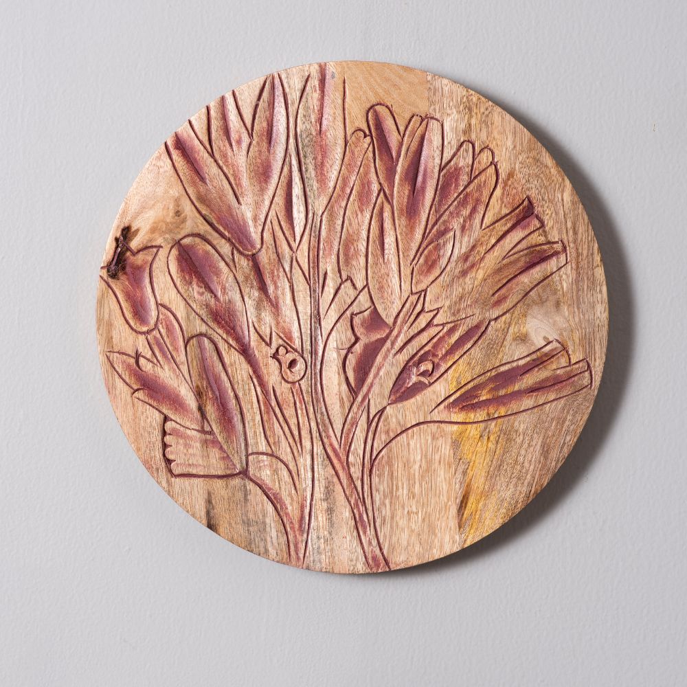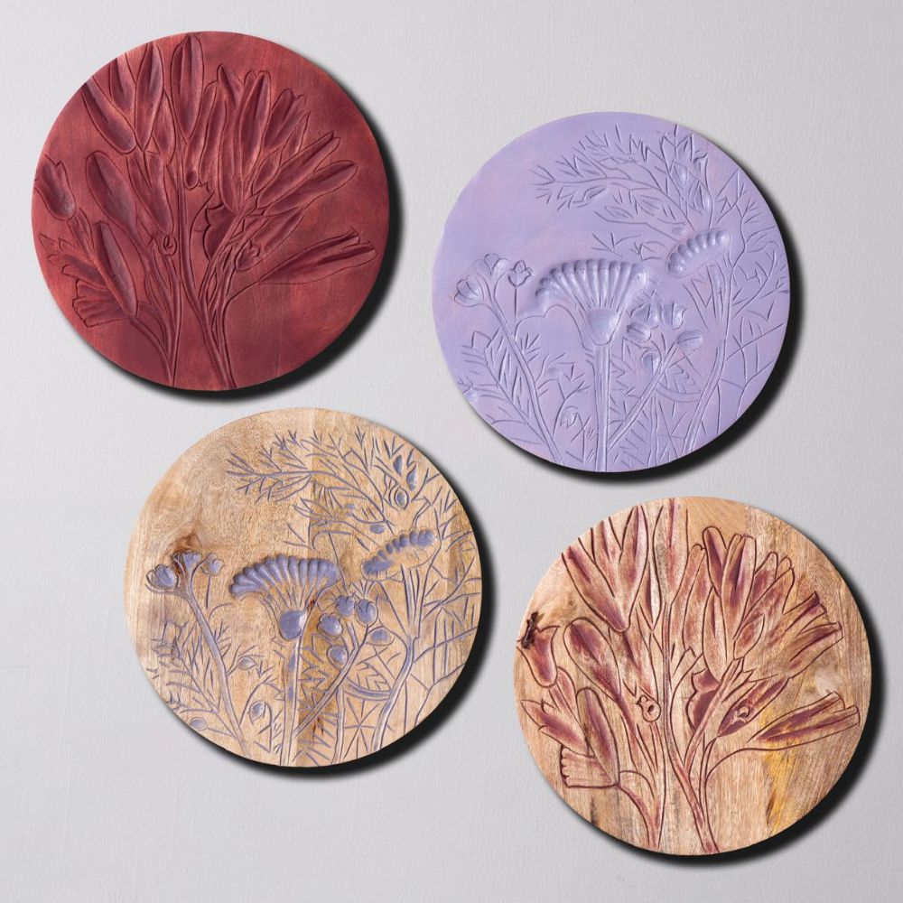 Each plate is a one-of-a-kind artwork that captures the beauty of floral patterns with carved precision and matte colors.