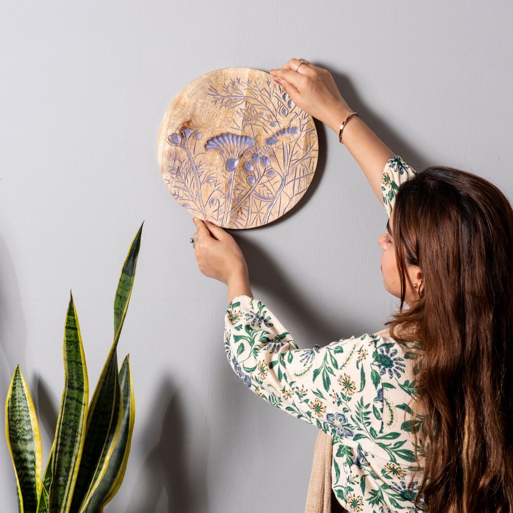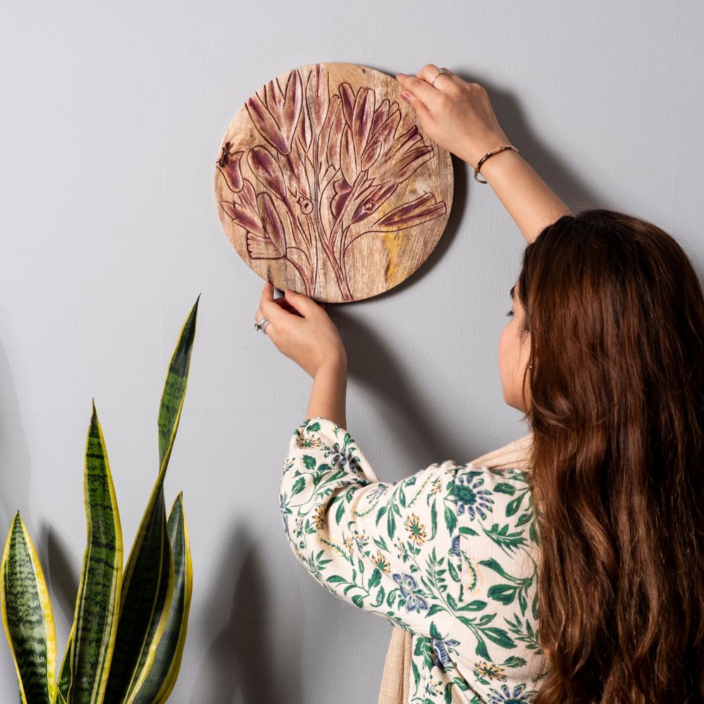 Add a rustic yet artistic charm to your walls with this set of 4 handcrafted wooden wall plates featuring bold floral engravings. With two plates in deep red and two in soft lavender, this collection blends earthy warmth with soothing pastels, making it perfect for contemporary and traditional interiors. Packed & quality-checked by Indianshelf.