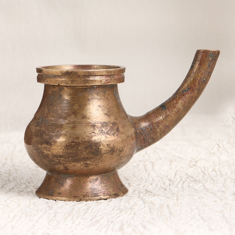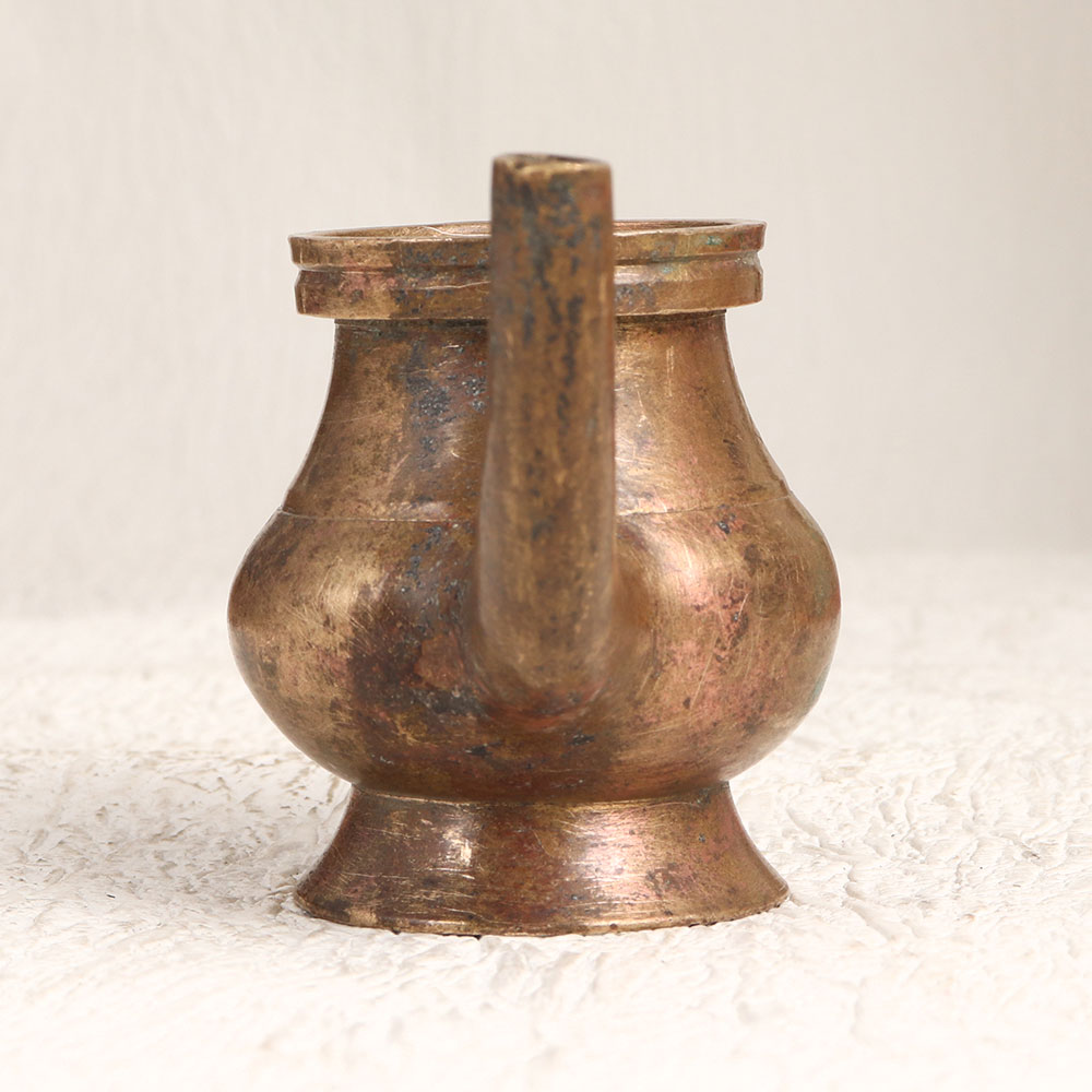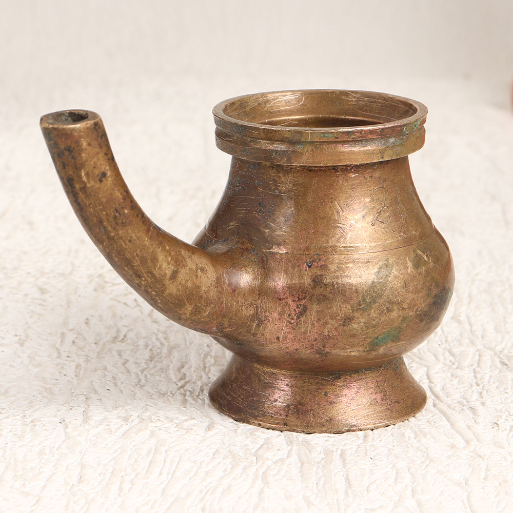 This small vintage brass holy water pot with a spout boasts an enchanting antique brown finish. Handmade by highly talented Indian artisans, this exquisite piece is a testament to their dedication and craftsmanship. Crafted from high-quality brass, this holy water pot is a work of art that can seamlessly blend into any setting. Whether you choose to place it in your home, office, restaurant, hotel, cafe, or shop, it serves as a captivating decoration piece, doubling as a unique flower pot with its spout adding a touch of whimsy to your floral arrangements. Steeped in tradition, this pot was originally used during prayer ceremonies to offer water to devotees, making it a symbol of reverence and spirituality. Now, it can find a new purpose in your vintage collection or be showcased in exhibitions, where its timeless beauty can be admired by all. Looking for a thoughtful gift? This brass holy water pot is an ideal choice for your family, friends or relatives on special, festive, or auspicious occasions. It embodies the rich heritage of Indian craftsmanship and spirituality, making it a meaningful and cherished present for any occasion. Elevate your decor and honour tradition with this remarkable piece of artistry.