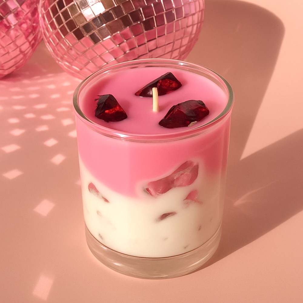 The caf inspired layered look paired with a strawberry toned finish makes this candle a decorative accent that feels playful, modern, and instantly eye catching.