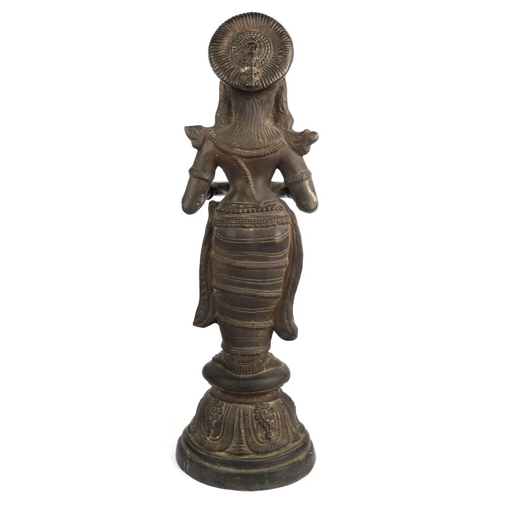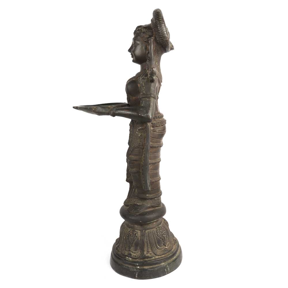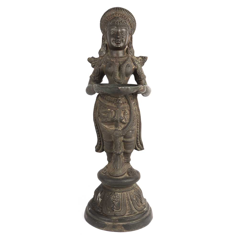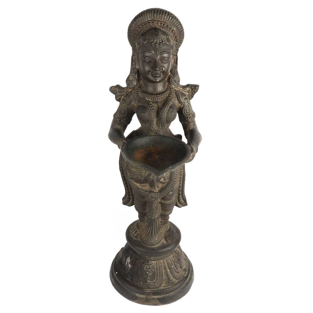 Bring prosperity and good fortune with this brass standing Deeplaxmi statue made using the old lost wax method by expert artisans of india. Living room decoration, hotel , spas, school, shop decoration, diwali gift, new year gift, house warming gift.