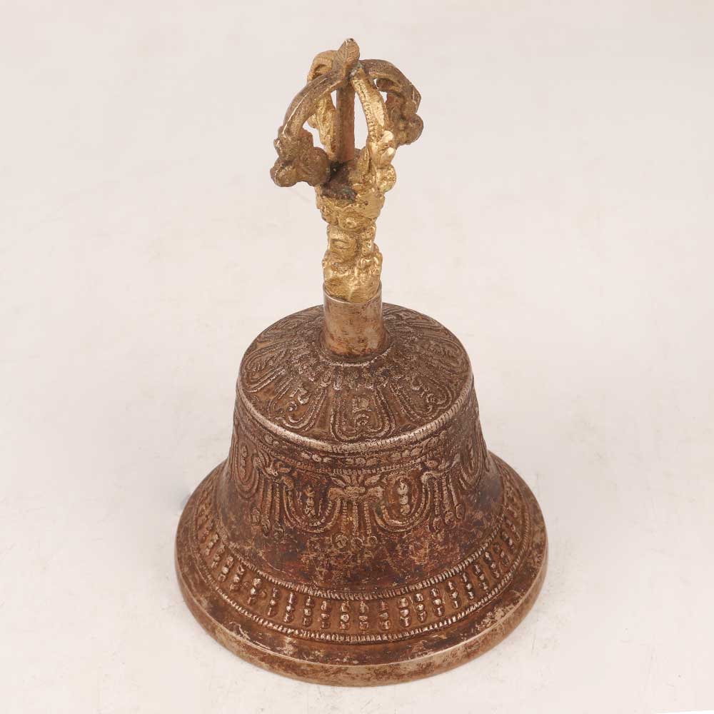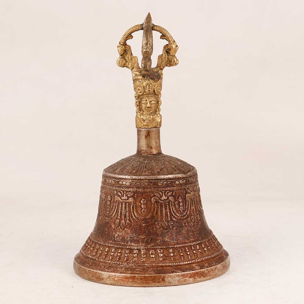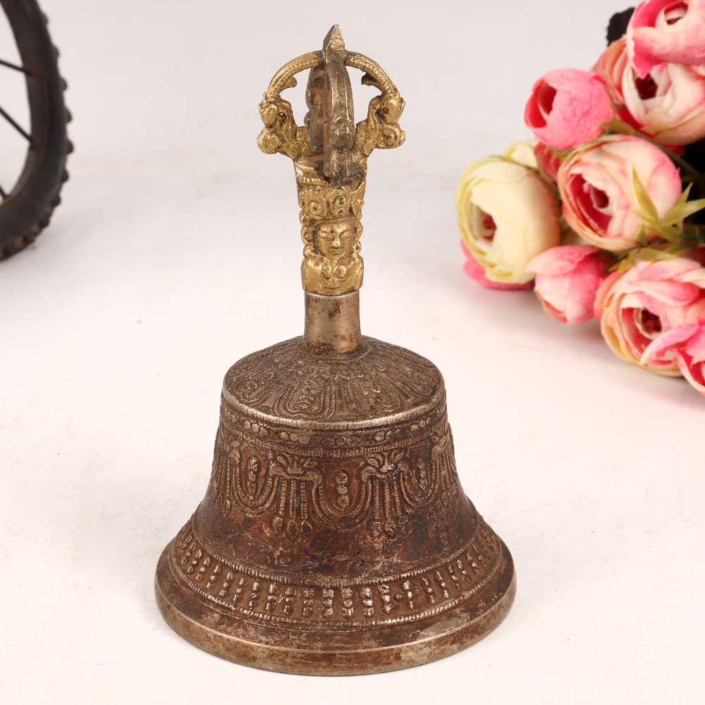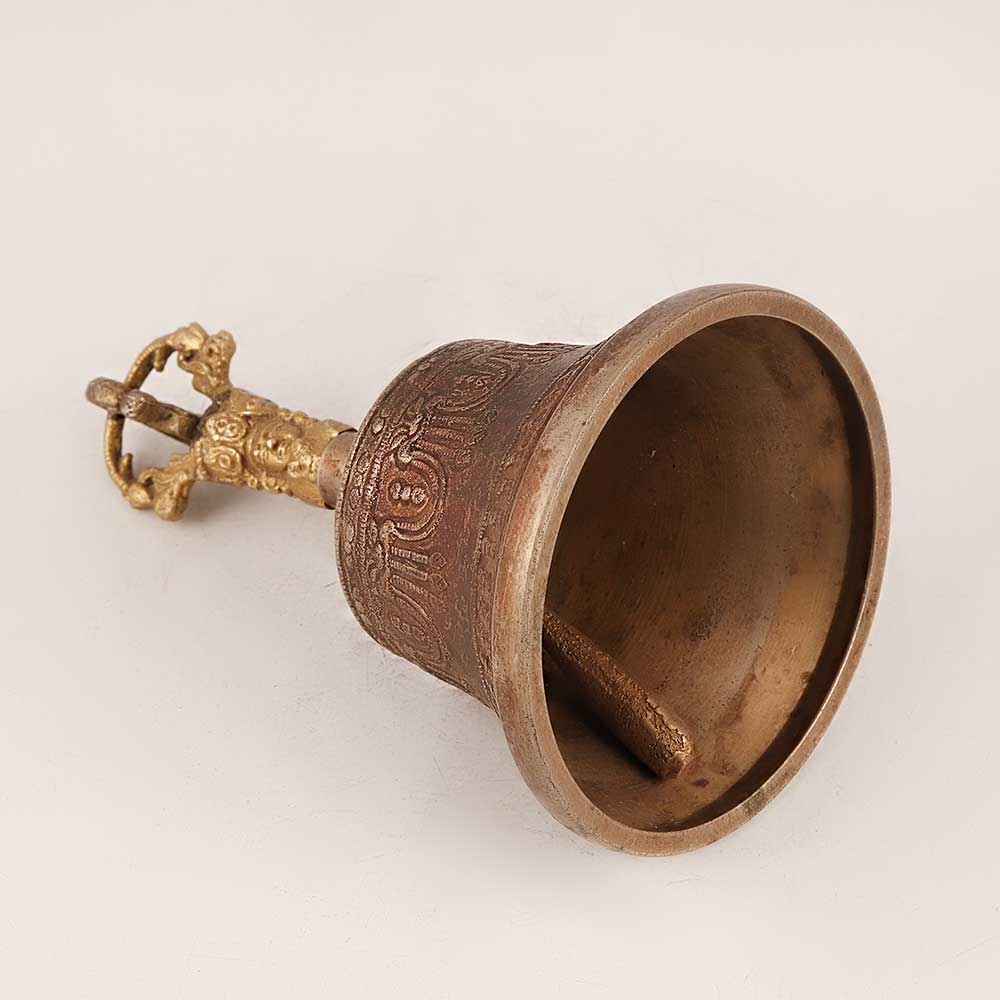 Bring the serenity and beauty of Buddhist art in your home interiors with our Bell Metal Temple Bell. Crafted with precision by skilled artisans, this bell embodies the essence of devotion and tranquillity. The antique brown finish adds a touch of timeless elegance, enhancing the intricate engravings that adorn its surface, depicting intricate Buddhist motifs that evoke a sense of spiritual contemplation. The highlight of this masterpiece is the deity engraving on the handle, which adds an extra layer of divine connection. Made from high-quality bell metal, the bell resonates with a melodious and soothing sound, perfect for morning and evening prayers. Its versatile design allows it to complement various settings, making it a perfect addition to your home, office, restaurant, hotel, or cafe's prayer room. Beyond its religious significance, this bell doubles as a captivating piece for exhibitions and vintage collections. It serves as an ideal gift, symbolizing well wishes and blessings for your family, friends or relatives during special, festive, or auspicious occasions.