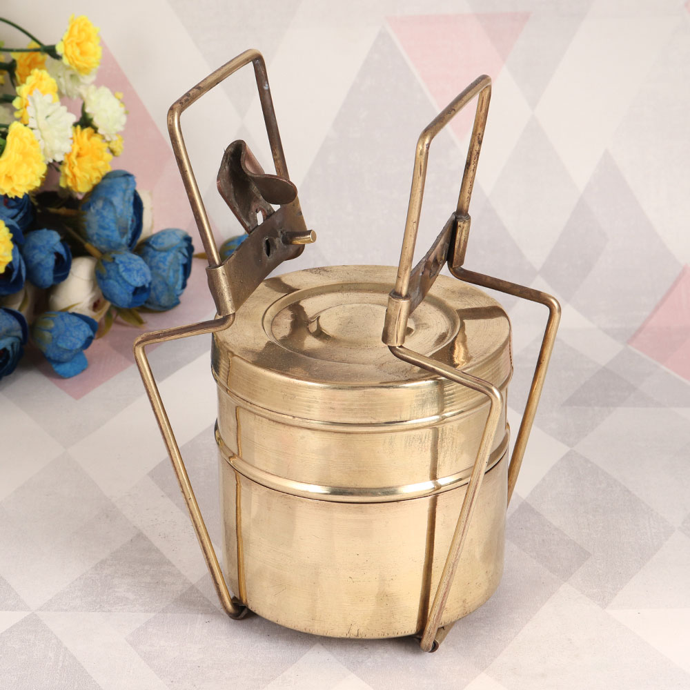 Buy a Brass Tiffin Box online with a captivating antique brown finish and a charming lock mechanism. Handcrafted by professional Indian craftsmen with a profound love for their craft, this exquisite piece is a testament to their dedication and expertise. Originally designed for the purpose of carrying meals, this vintage brass tiffin box has transcended its utilitarian roots to become a work of art. Its aged patina and intricate detailing evoke a sense of nostalgia and authenticity that adds character to any space. With two spacious compartments, it provides a touch of old-world elegance to your home, office, restaurant, hotel, or cafe decor. Place it on a rustic wooden shelf, a vintage-inspired table, or even use it as a unique centerpiece to spark conversations among guests. This antique brass tiffin box makes for an exceptional gift for your family, friends or relatives on special, festive, or auspicious occasions.