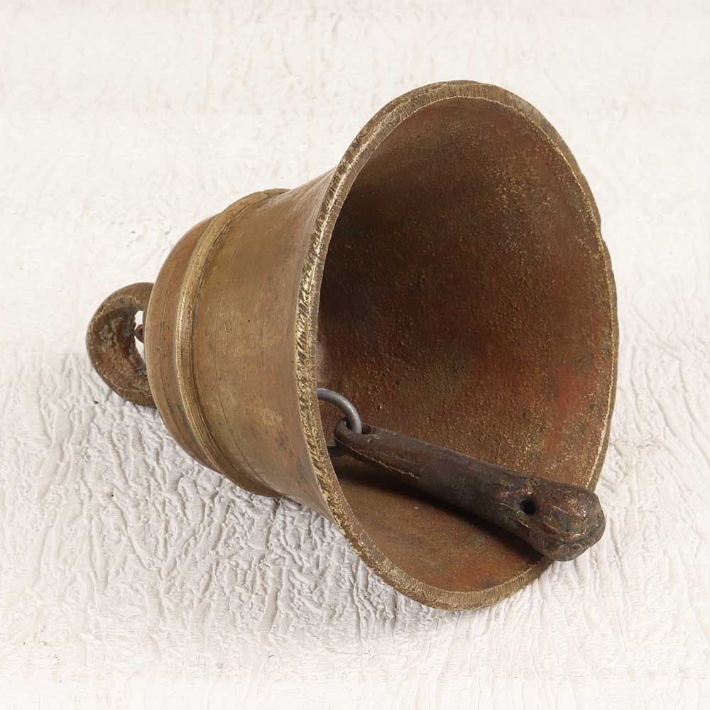 Wake up to spiritual serenity with this elegant vintage bell metal temple bell. Crafted from bell metal with a loop for hanging, this plain brown finished bell creates a soothing, meditative tone when rung gently by hand. Let the rich, mellow tone of this bell bring a sense of calm and mindfulness to your home. Hang it near your meditation space or front door to start your day grounded and focused. The minimalist design blends into any decor while the bell's unique voice sings out tranquility. Give your home a touch of spiritual style with this special bell. A must-have for yoga studios, spiritual retreats, or anyone looking to cultivate peace. This handcrafted bell connects you to ancient tradition and timeless ritual.