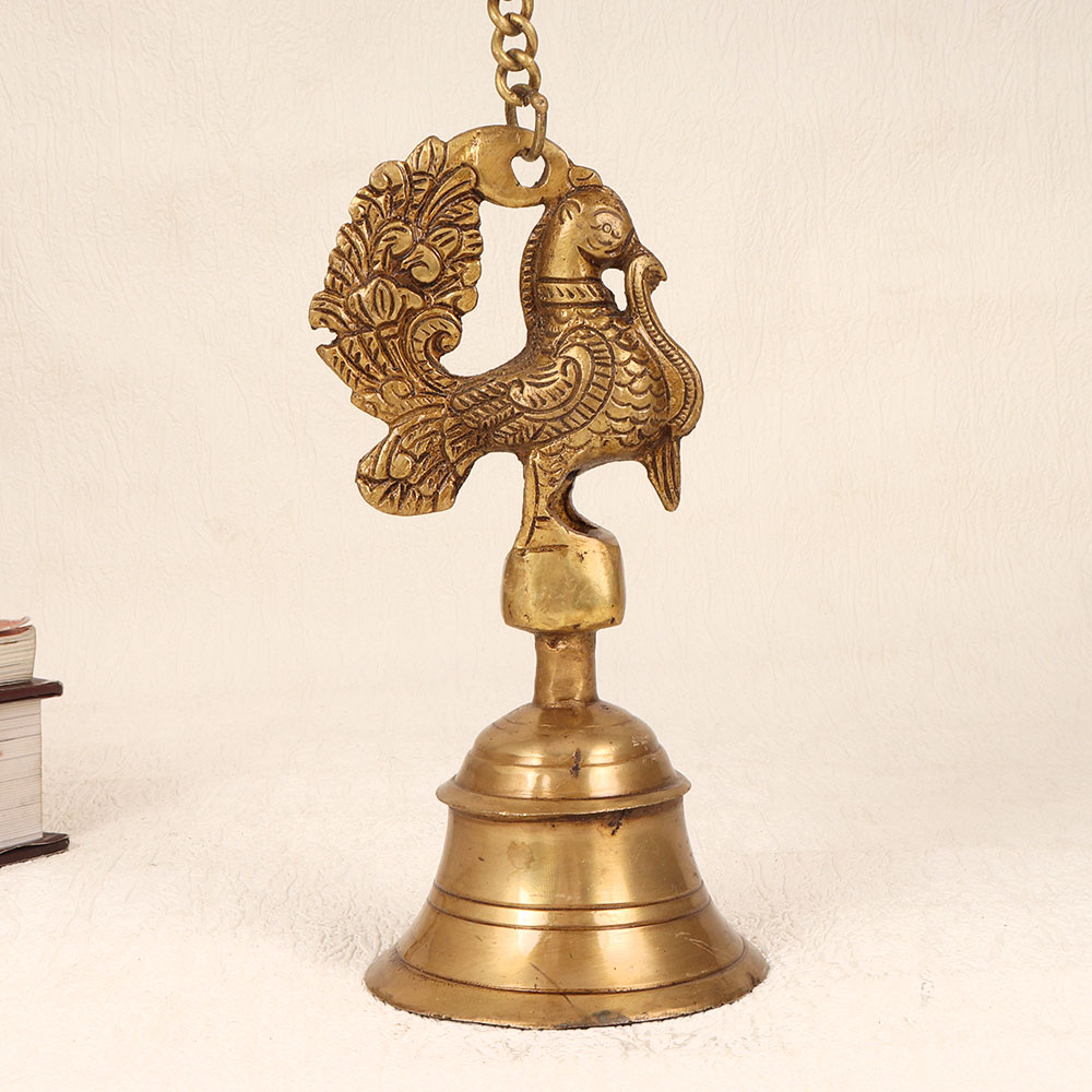 This Vintage Bell Metal Hanging Temple Bell adorned with a majestic peacock carving atop is handcrafted by highly talented Indian artisans hailing from Central India. Crafted from high-quality bell metal, this exquisite bell captures the essence of traditional craftsmanship, offering a nostalgic touch with its antique brown finish. Ideal for adorning temples or prayer rooms, this bell comes complete with a chain for easy hanging, creating an ambience of serenity and spirituality. Beyond religious spaces, this versatile piece seamlessly complements various settings such as homes, offices, restaurants, hotels, or cafes. Its aesthetic allure extends beyond functional use, making it a splendid decorative item that effortlessly blends into any vintage-themed collection. The bell serves as an eloquent gift choice for your family, friends or relatives during special, festive, or auspicious occasions, embodying the richness of Indian heritage and artistry. Each ring resonates with the history and craftsmanship passed down through generations, offering a unique blend of cultural significance and timeless beauty.
