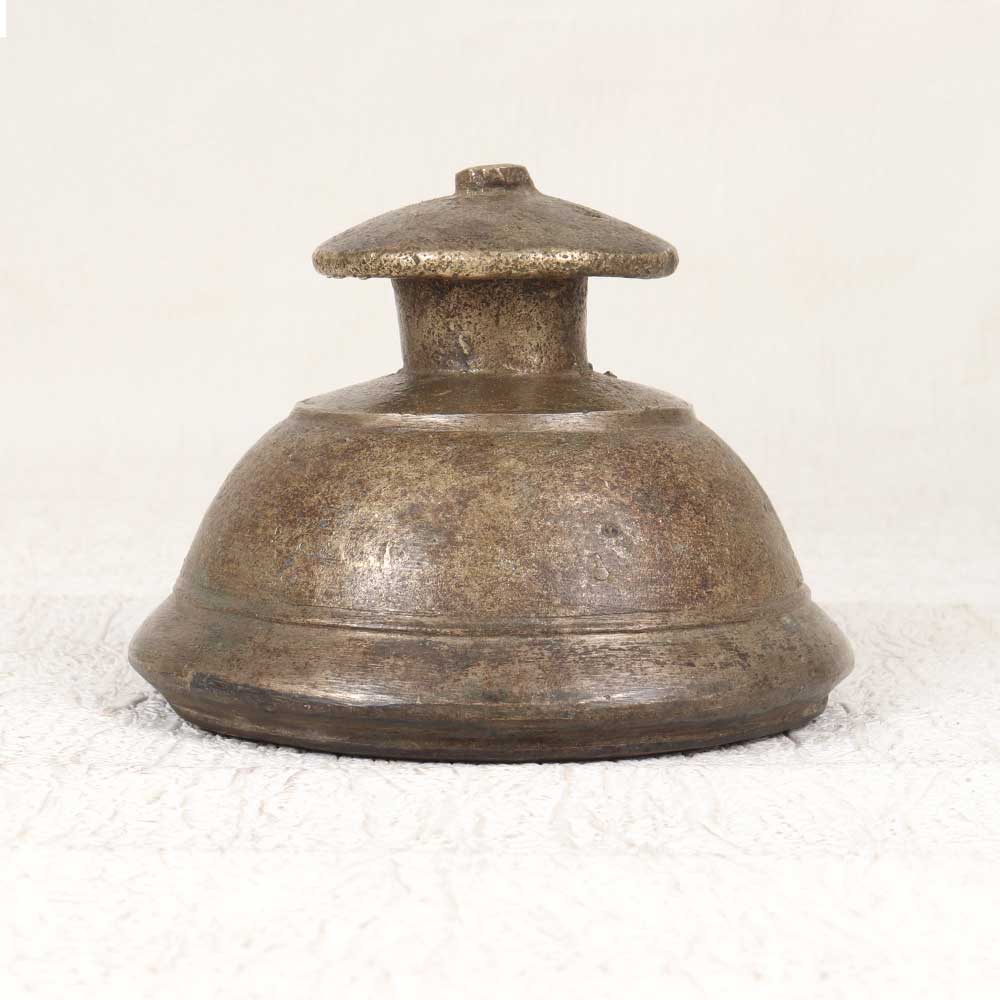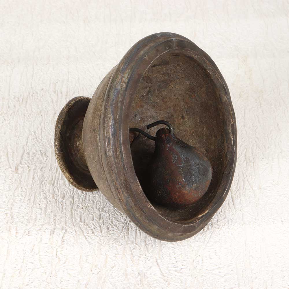 Channel the tranquil essence of Indian temples with this ornate vintage brass bell. Intricately cast decades ago, this sacred instrument possesses a rich, resonate tone that calms the spirit. Sounding this temple bell creates a melodic atmosphere perfect for yoga, meditation, or personal rituals. Let the looping tones quiet your mind and transport you to a serene inner sanctuary. In India, bells like these hang in temples and shrines to gently announce times of worship and gather focus during rituals. Now you can bring that same peaceful energy into your own reflective practices. Whether you appreciate its artistic craftsmanship or spiritual resonance, this vintage brass bell makes a meaningful addition to any home. Keep it close as an inspiring reminder to pause and cultivate inner tranquility amidst the hurry of daily life.