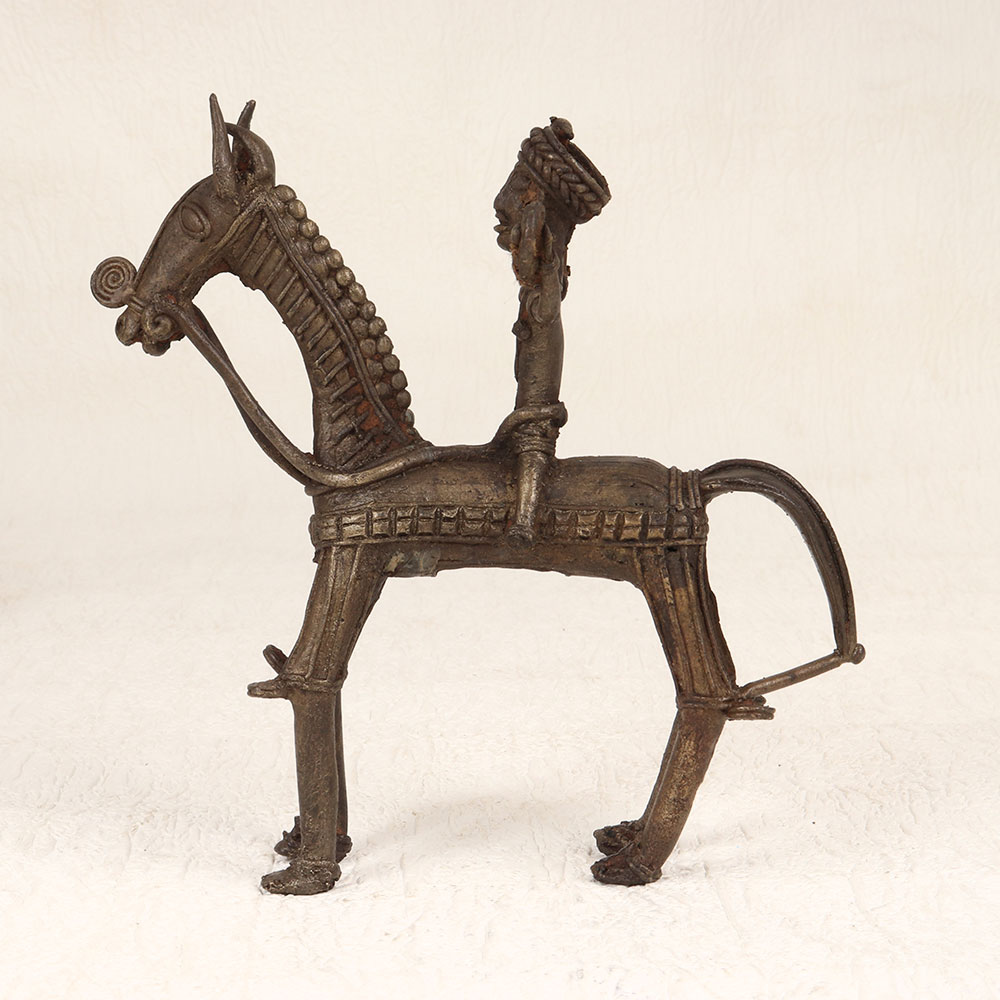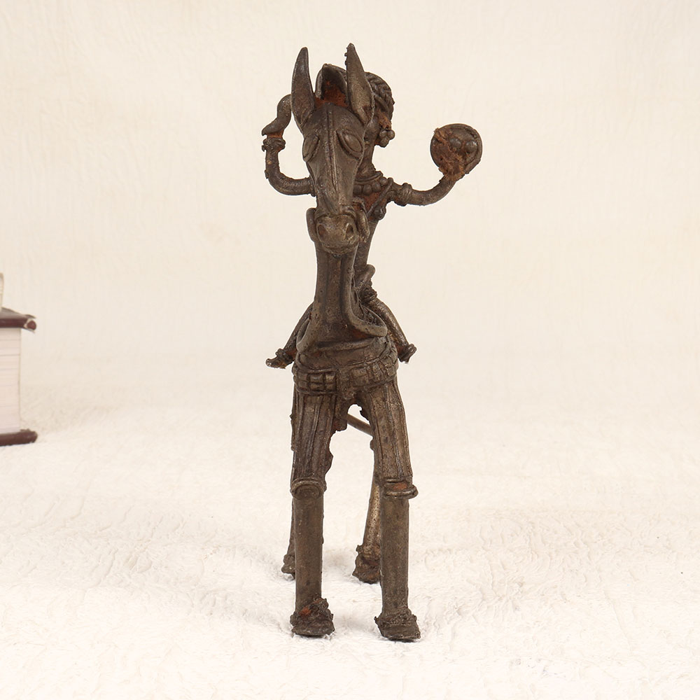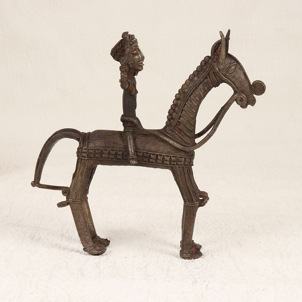 Experience the enchanting allure of cultural craftsmanship with our Vintage Brass Horse and Rider that is a masterpiece handcrafted by professional artisans from Bengal, India. This exquisite piece showcases tribal artistry, seamlessly blending tradition with timeless elegance. Cast in high-quality brass, its antique brown finish imparts a warm and nostalgic aesthetic, evoking a sense of heritage. Perfect for adorning diverse environments, this unique creation effortlessly enhances the ambiance of homes, offices, restaurants, hotels, or cafes. Its versatile appeal transcends settings, making it an ideal addition to your vintage collection. Beyond personal enjoyment, this captivating piece also makes for a thoughtful and meaningful gift for your family, friends or relatives during special, festive, or auspicious occasions.