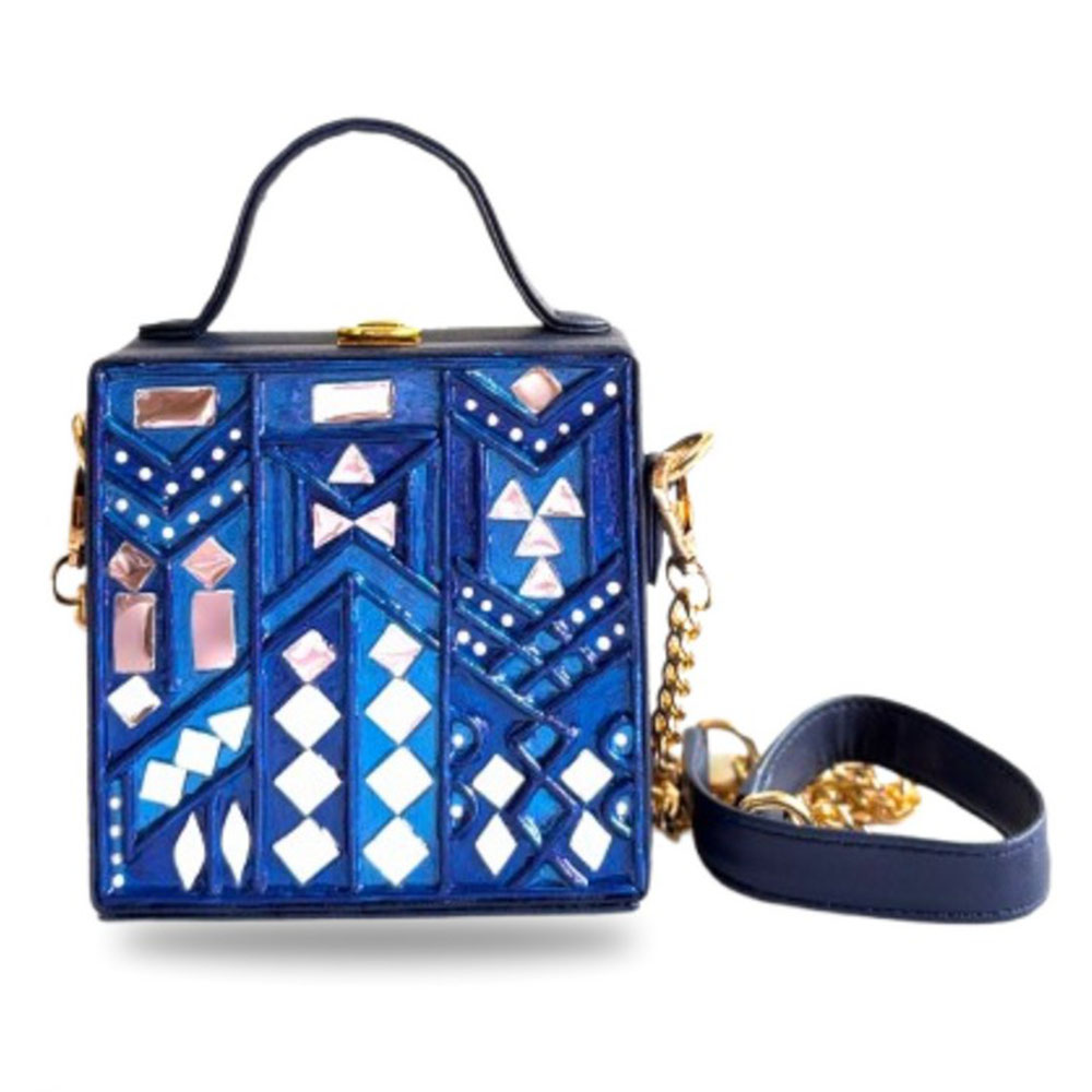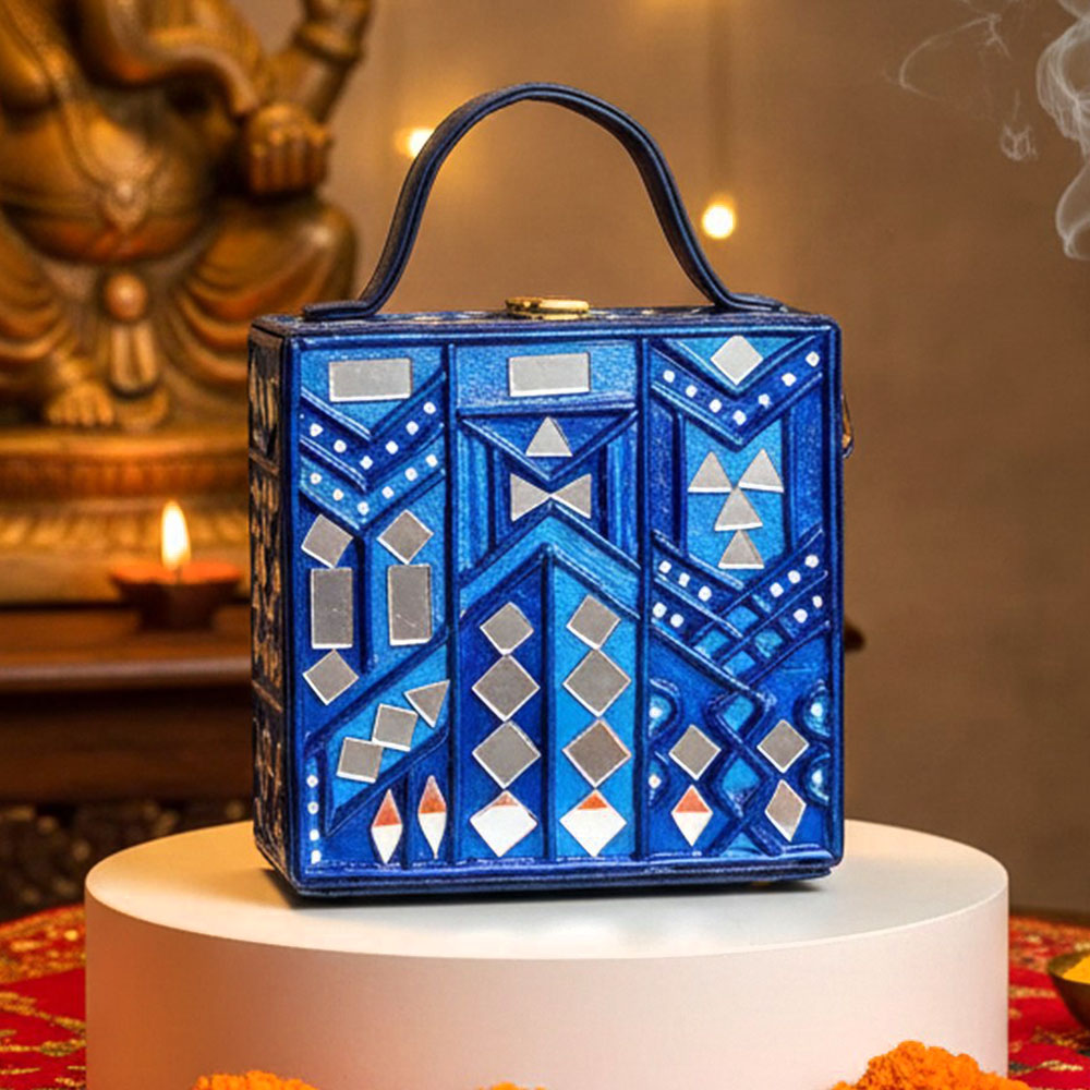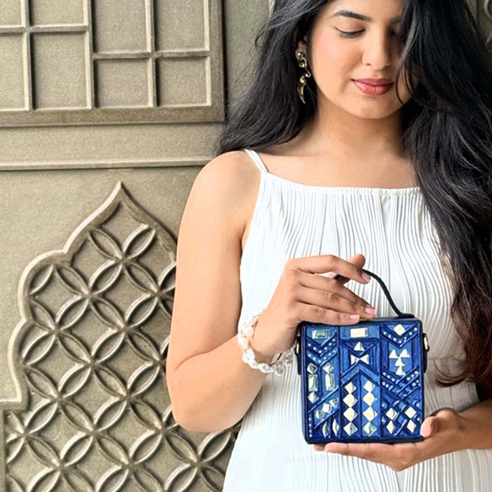 This mini sling box bag showcases azure inspired Lippan art that blends tradition with modern style. Its compact box form and mirrored details make it appealing to collectors decorators and gifters alike. Each piece is handcrafted by skilled artisans and packed and quality checked by Indianshelf.Azure Charm DetailsThis charming piece features azure motifs in fine Lippan art appealing to those who love unique cultural accessories and those seeking meaningful gifts.Azure toned motifs and mirror inlay are applied by hand in Lippan art style.Entirely handmade and never machine madeHardwearing construction makes it suitable for daily and festive use.Vital Specs and Information Origin: India. Safely packed and quality checked by Indianshelf Slim and light it hangs gracefully on the shoulder.Use Case ScenariosUse as a unique accessory at home or out to showcase the azure charm motif.Gift this azure charm themed bag for festivals birthdays or special celebrations.Enhance boutique displays with its artisanal azure charm design to attract customers.Event planners and collectors can use it as an eye catching cultural accent piece.Careful HandlingKeep the azure charm bag looking fresh by storing it in a dry place and cleaning it gently with a cloth. Avoid moisture and abrasive cleaners to protect the hand crafted art.User Queries AnsweredWhat gives this bag its azure charm?Artisans hand paint the azure hue and embellish it with Lippan art for a distinctive look.Is it suitable for everyday use?The mini box bag combines beauty with durability perfect for daily wear.How much can this mini piece carry?It holds daily essentials such as cash cards and lipstick.Does the strap adjust easily?Yes the adjustable sling ensures a comfortable fit.Legacy Craft SupportEvery piece reflects heritage artistry and careful attention to detail. All our products are handmade never machine made ensuring individuality.