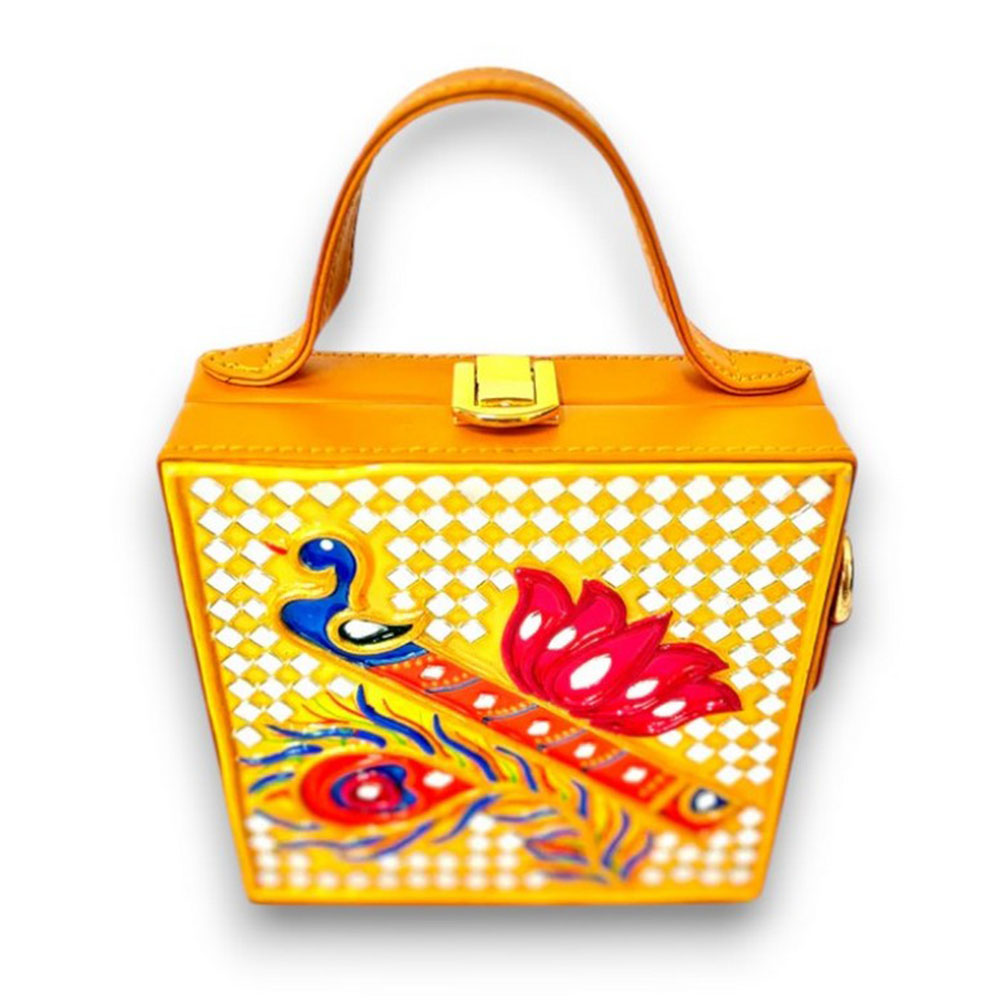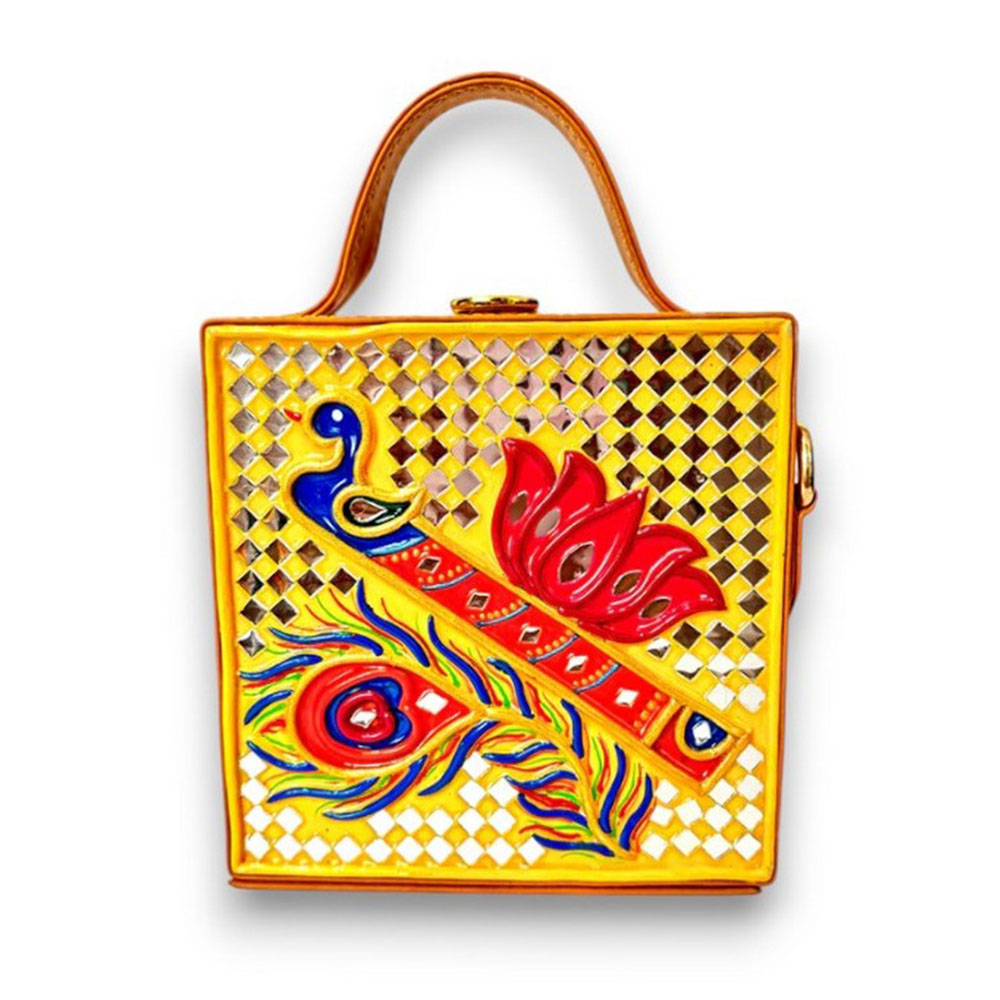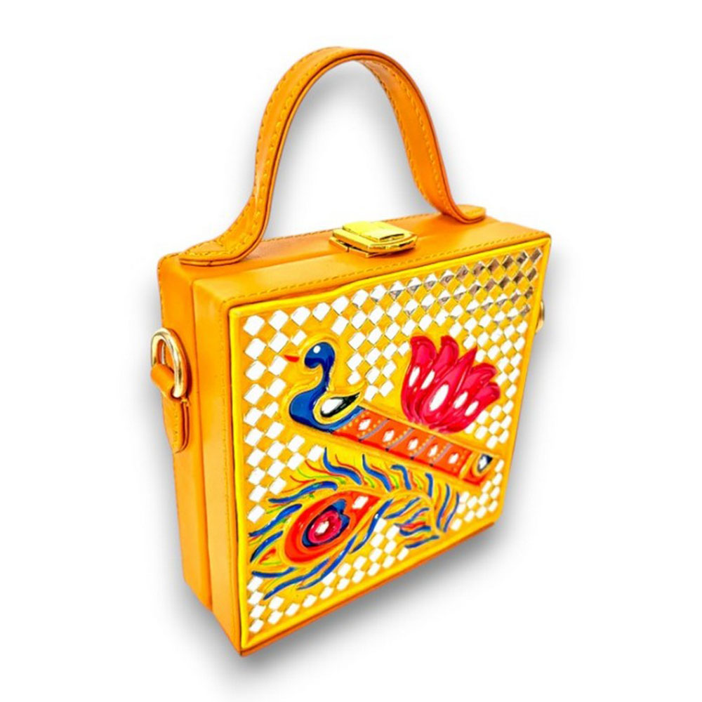 This mini sling box bag showcases bansuri inspired Lippan art that blends tradition with modern style. Its compact box form and mirrored details make it appealing to collectors decorators and gifters alike. Each piece is handcrafted by skilled artisans and packed and quality checked by Indianshelf.Bansuri Theme HighlightsThis charming piece features bansuri motifs in fine Lippan art appealing to those who love unique cultural accessories and those seeking meaningful gifts.Bansuri themed details are carefully crafted with Lippan art to evoke melody.Entirely handmade and never machine madeIts robust structure ensures longevity and versatile use.Detailed Craft Overview Origin: India. Safely packed and quality checked by Indianshelf The small form factor makes it simple to carry.Suggested UsesUse as a unique accessory at home or out to showcase the bansuri motif.Gift this bansuri themed bag for festivals birthdays or special celebrations.Enhance boutique displays with its artisanal bansuri design to attract customers.Event planners and collectors can use it as an eye catching cultural accent piece.Caring for Your BagCare for the bansuri themed bag by keeping it dry and dusting it lightly. Avoid harsh cleaners and handle gently to maintain the hand applied Lippan art and mirror details.Inquiries AddressedWhat is the bansuri theme in this design?The bansuri theme honours musical heritage artisans render it through hand laid Lippan art.Can this box bag handle daily wear?The bag is handcrafted for durability and can accompany you everyday.Does it have enough room for essentials?It fits small necessities like keys coins and compact cosmetics.Is the sling strap detachable?The strap is adjustable and can be removed if you wish to use it as a clutch.Handcrafted PledgeEvery piece reflects heritage artistry and careful attention to detail. All our products are handmade never machine made ensuring individuality.